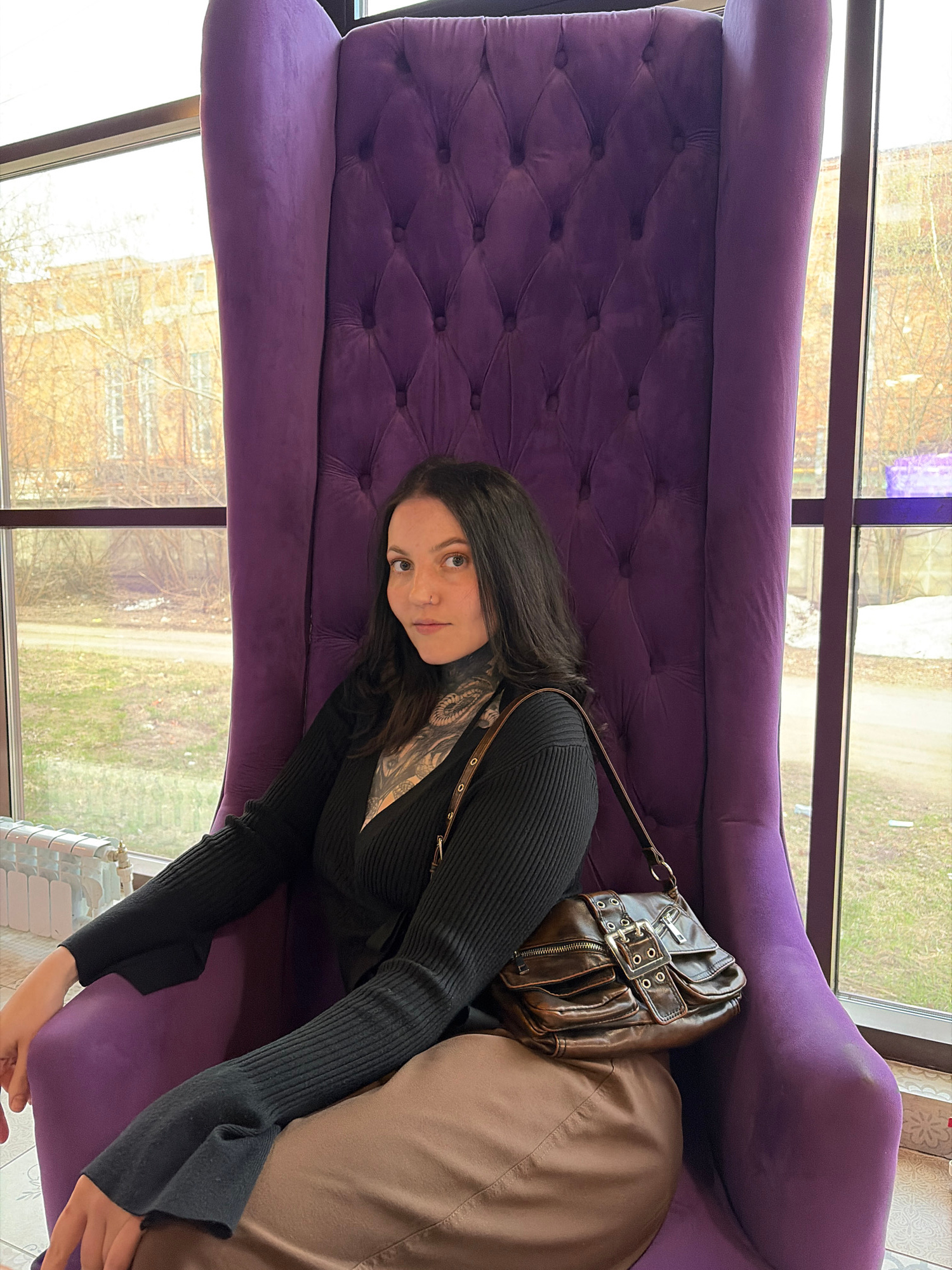 The image, rotated 90 degrees counter-clockwise, depicts a young woman seated in a large, plush, purple upholstered armchair or sofa. The chair features a tufted backrest and smooth seat. The woman ha…read more