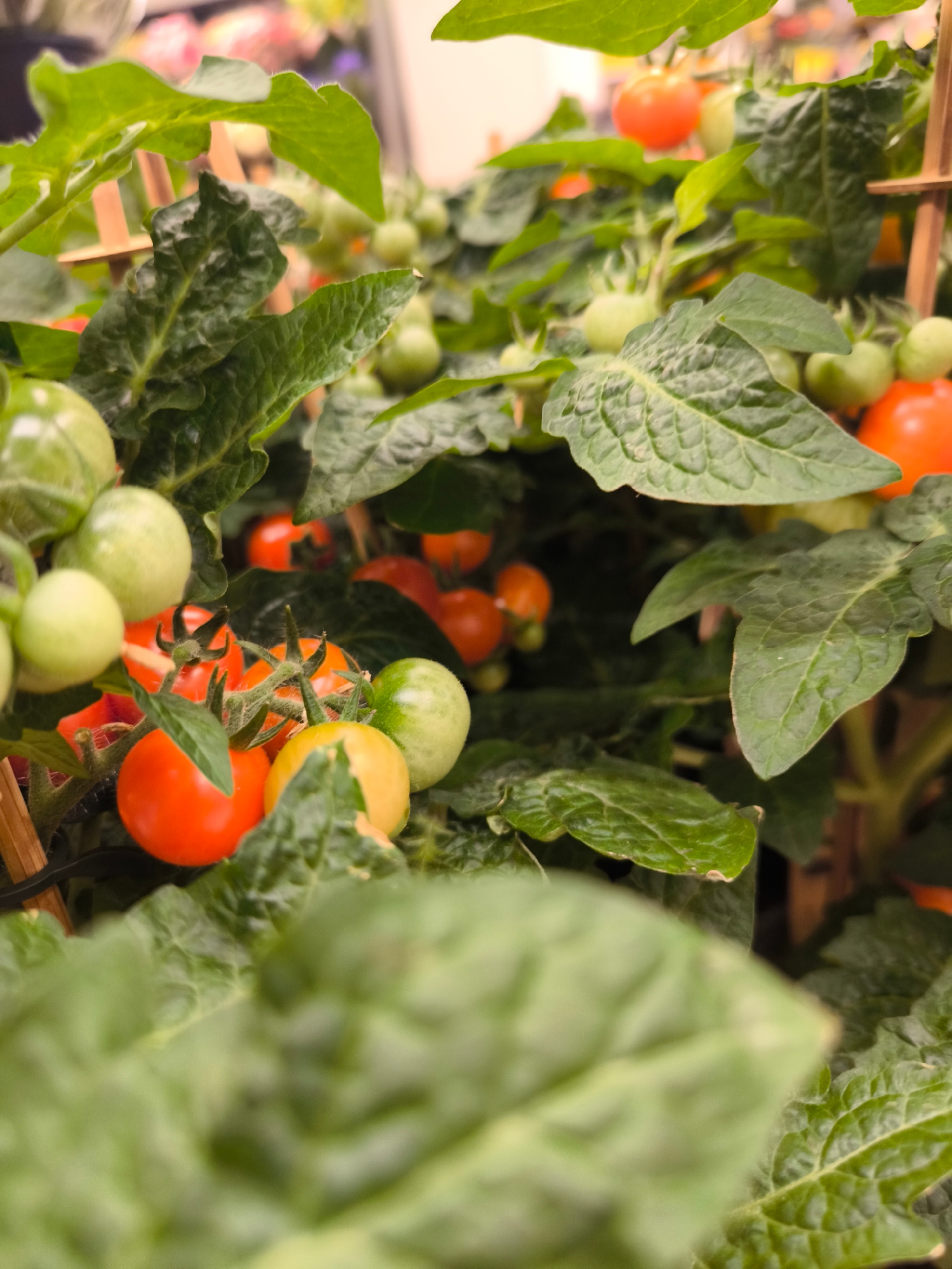 The image presents a close-up view of a tomato plant, laden with both ripe, red tomatoes and unripe, green ones. The plant is full of lush green leaves of varying sizes and shapes, which partially obs…read more