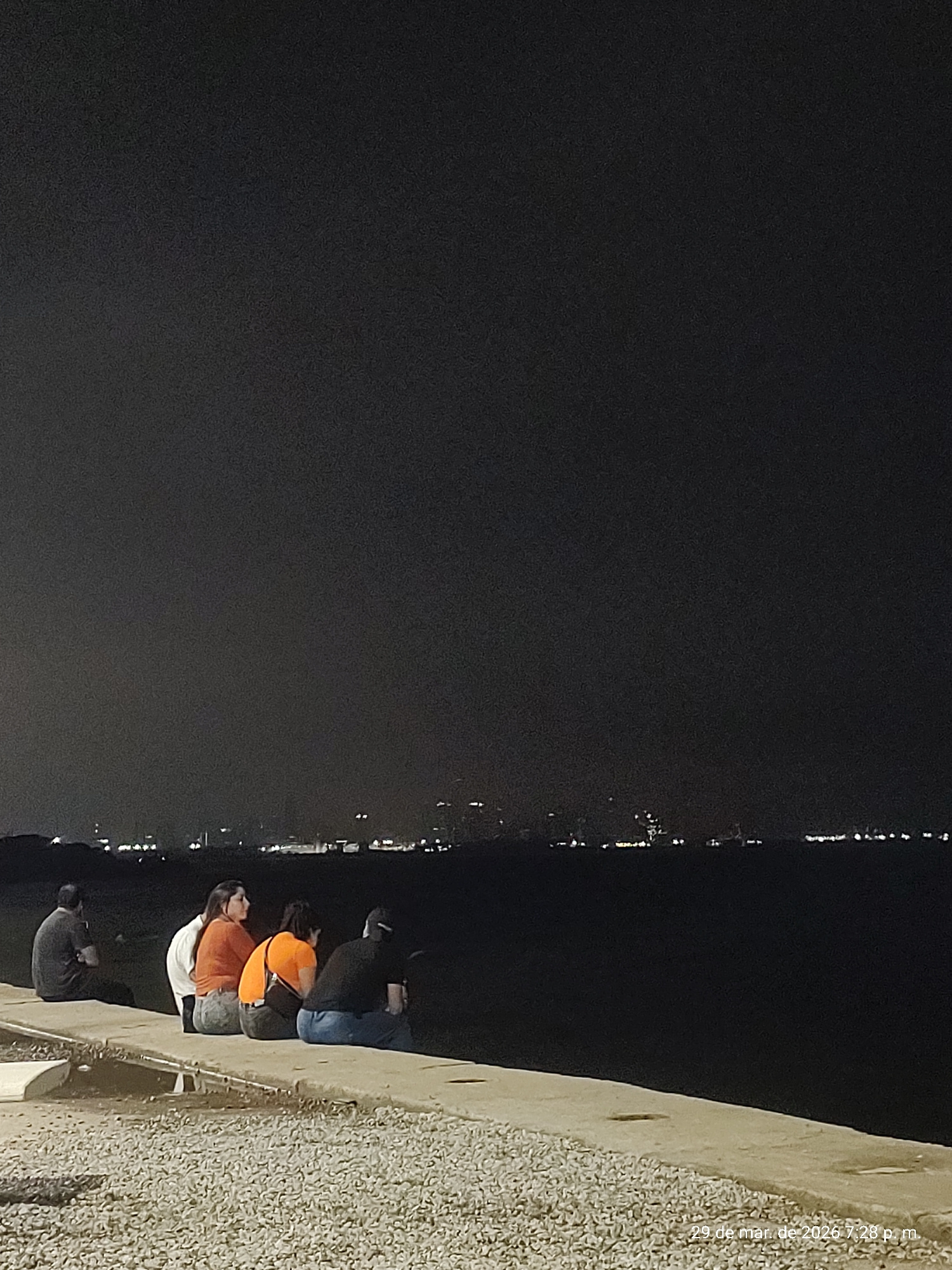 At night in Villa Domínico, Argentina, a group of people stand along a concrete structure, possibly a pier or walkway, overlooking a dark body of water with distant city lights. Several individuals ap…read more