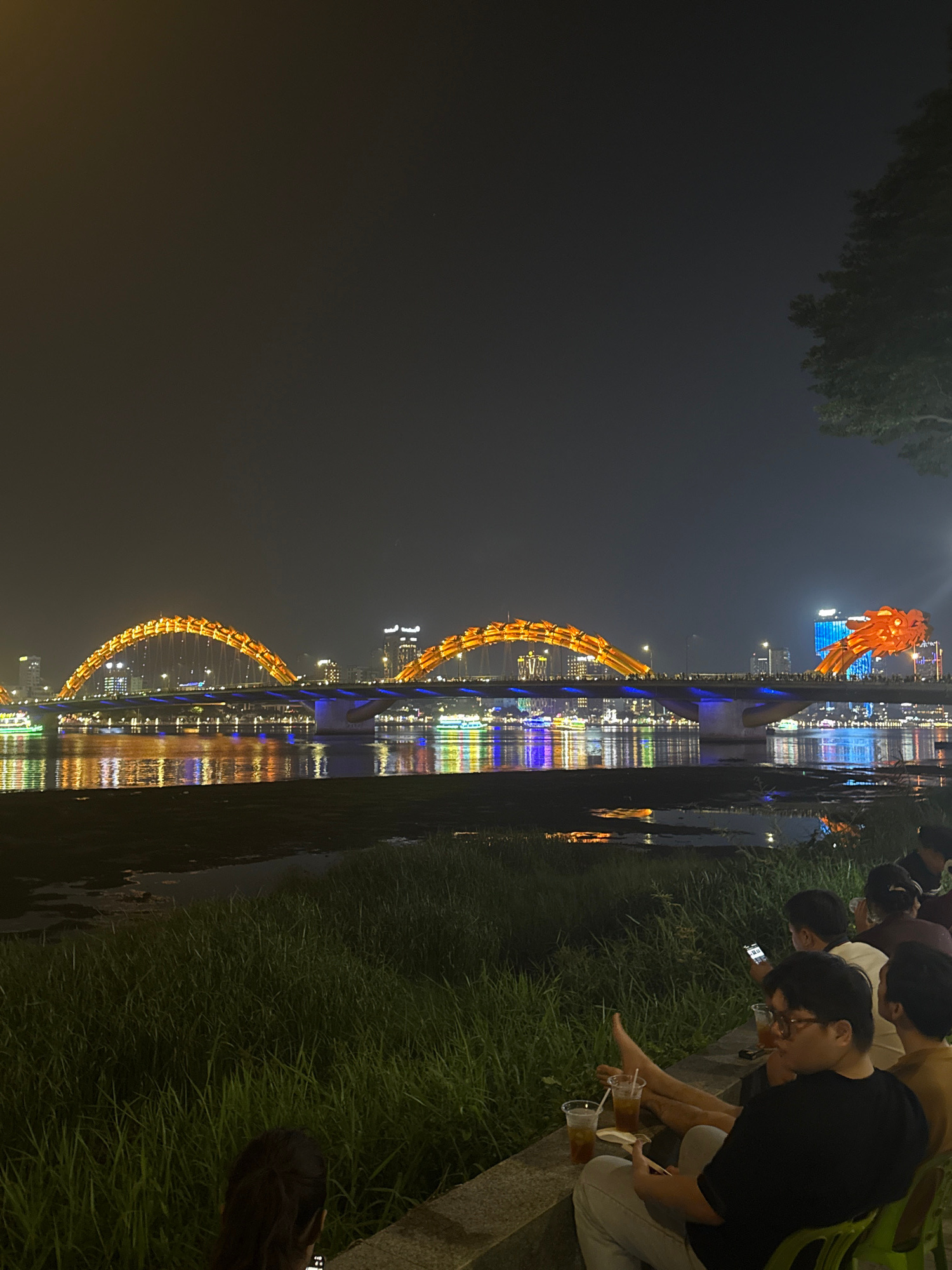 The image depicts a nighttime scene in Đà Nẵng, Vietnam, featuring the illuminated Dragon Bridge and other bridges spanning the river. A group of people are seated on a ledge near the riverbank, some…read more
