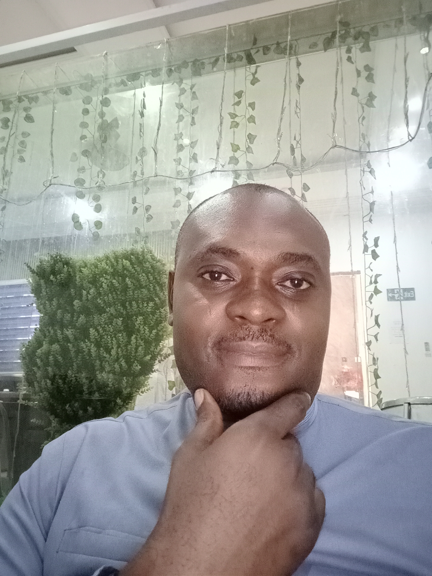 A medium close-up shot shows a man with dark skin, a shaved head, a trimmed mustache and beard. He is wearing a light blue shirt and resting his chin on his thumb, with the rest of his hand balled int…read more