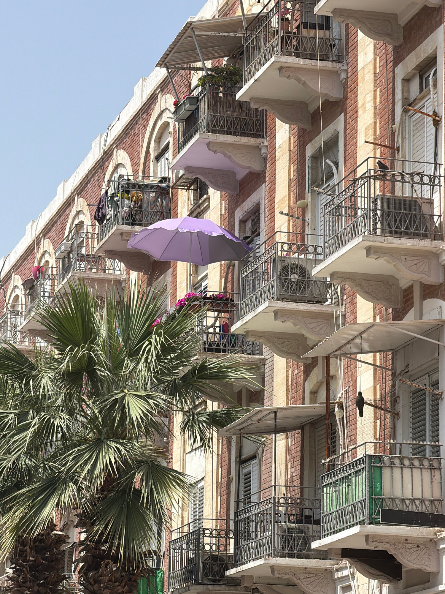 This image captures a vibrant, sunny urban scene, likely in Tel-Aviv, depicting a multi-story residential building partially framed by lush palm trees against a clear blue sky. The main subject is an…read more