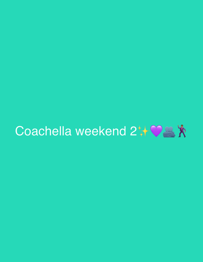 The image is a teal background with the text "Coachella weekend 2" followed by a sparkle emoji, a purple heart emoji, a rock emoji, and a dancing man emoji. It does not contain sufficient information…read more