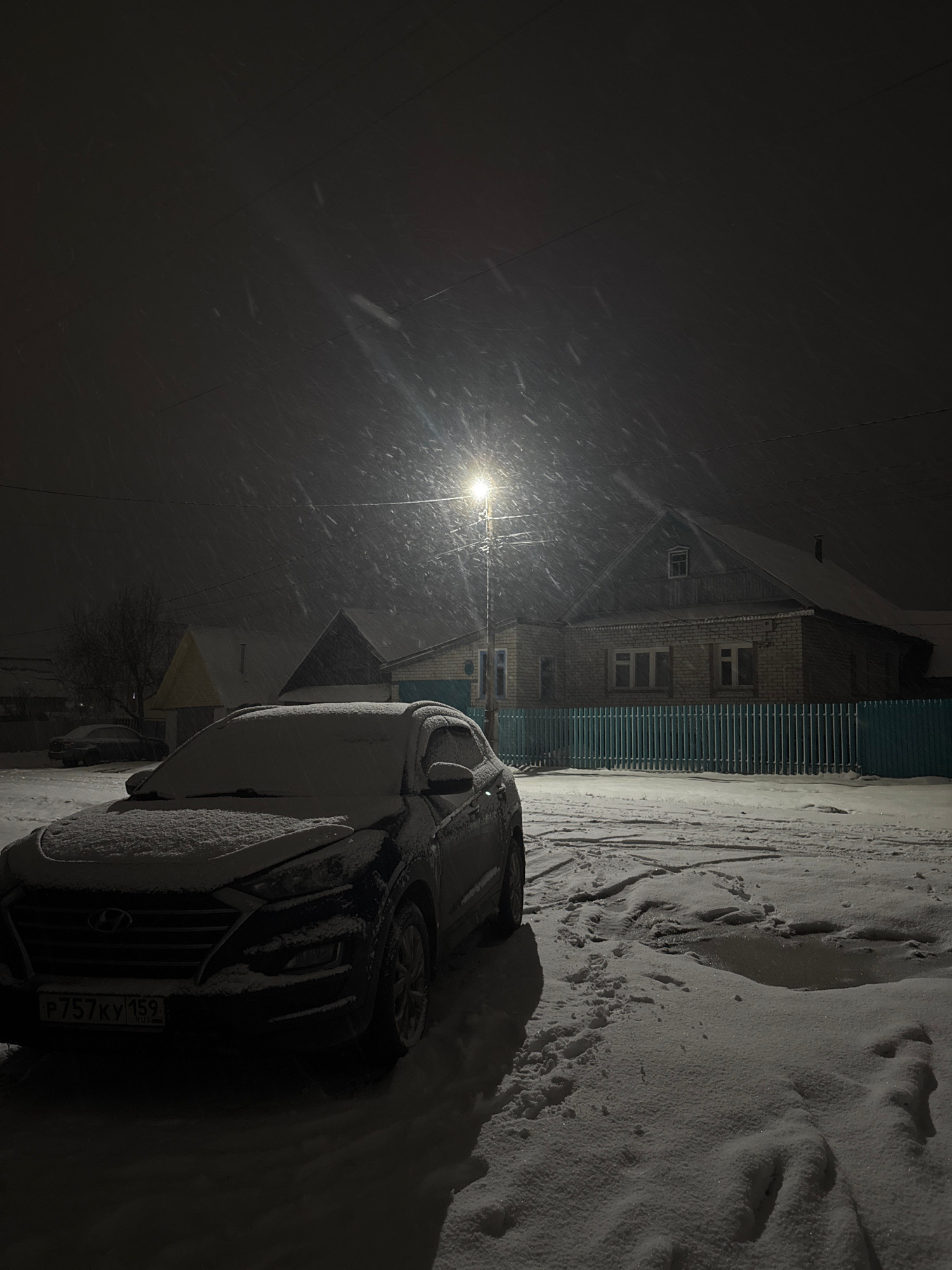 The image shows a snowy street scene at night in the city of Chaikovsky, Russia. A car, partially covered in snow, is parked on the side of the road. In the background, there is a brick building with…read more