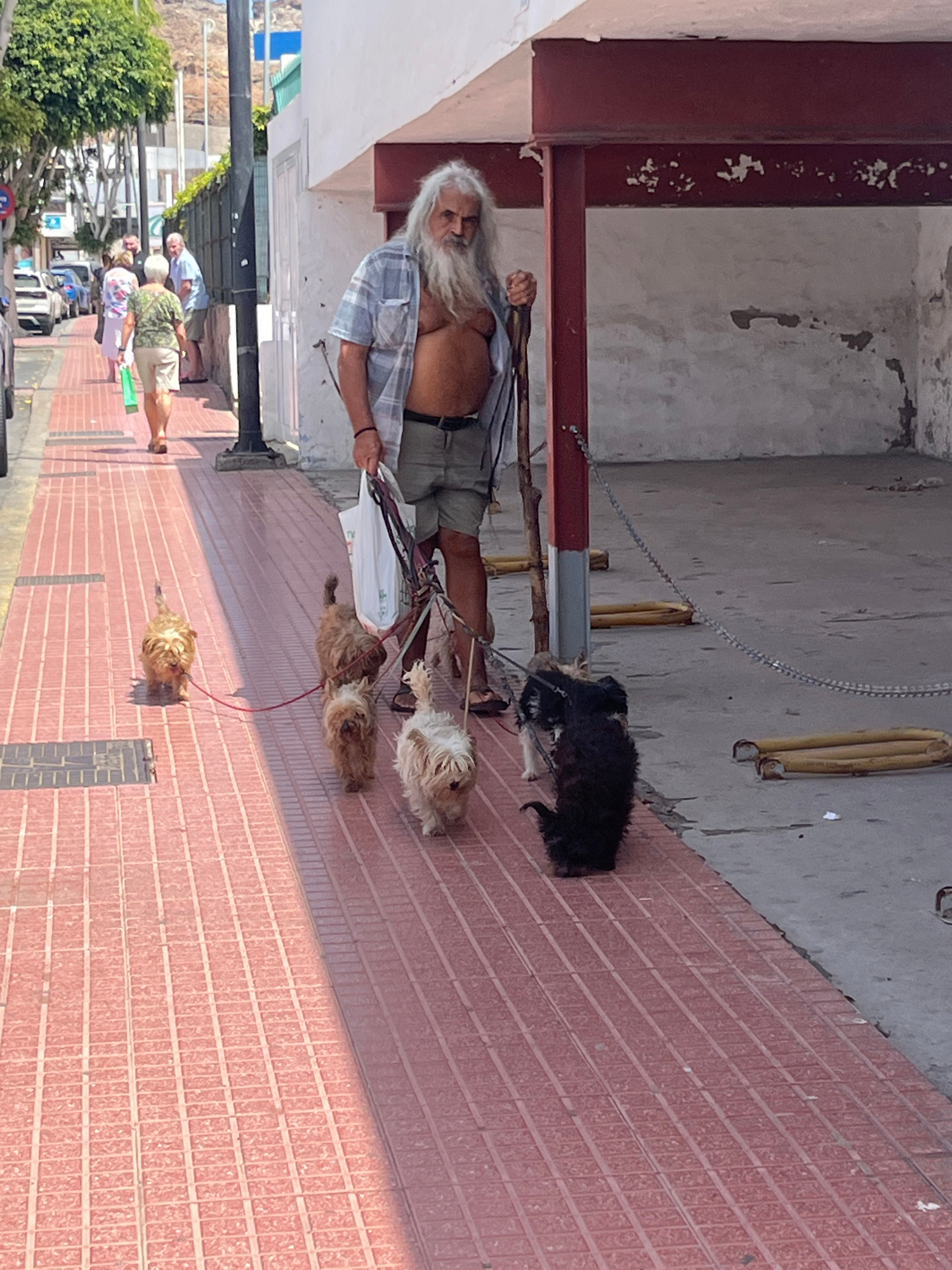 A middle-aged man with long grey hair and beard wearing a plaid shirt and tan shorts walks several dogs on leashes along a brick-paved sidewalk in a commercial area of Puerto Rico, Spain. The dogs varβ¦read more