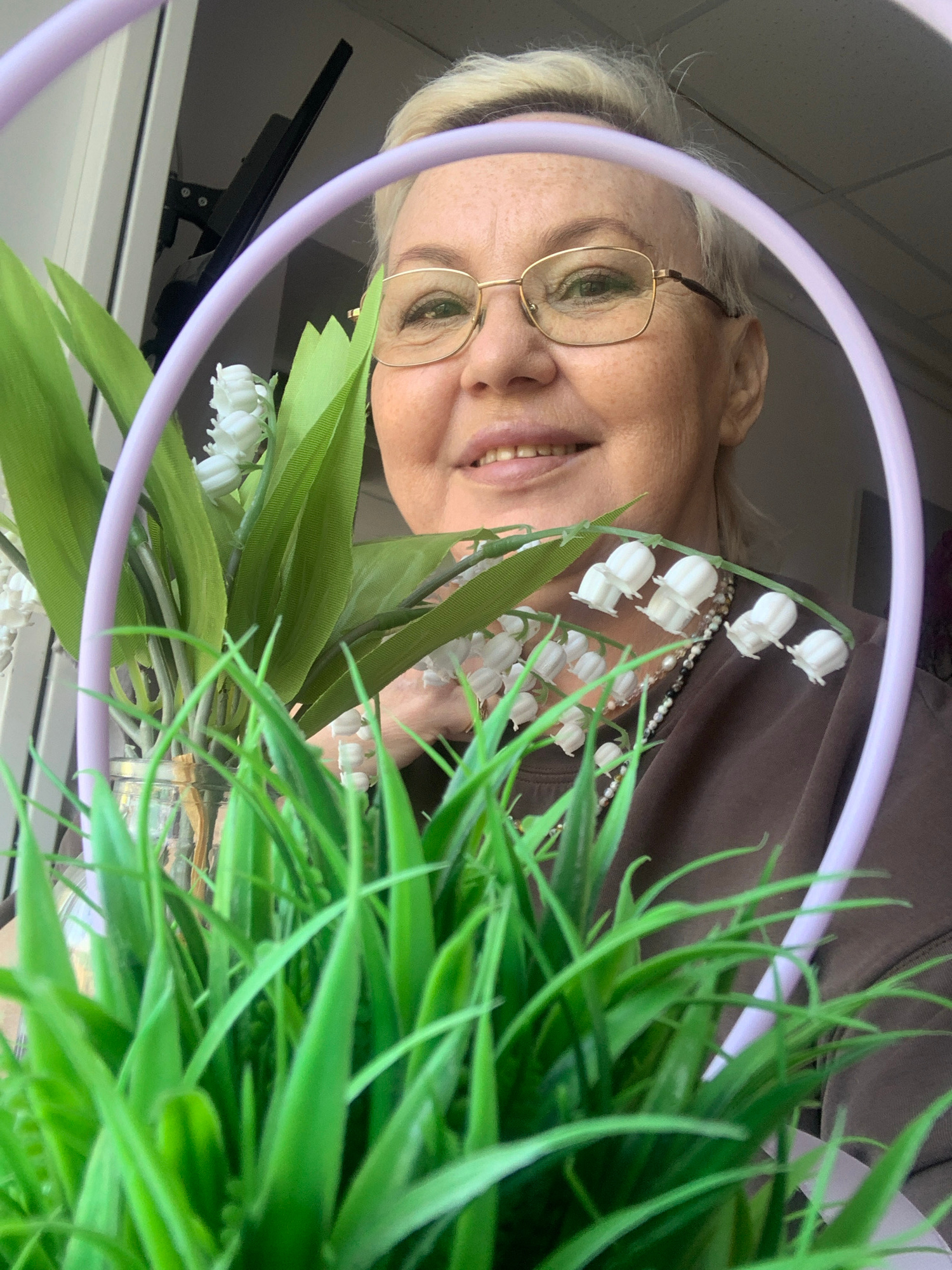 A woman wearing glasses and a brown shirt is holding a bouquet of lily of the valley flowers with green grass. She is positioned in front of a light lavender ring light and appears to be smiling. A wi…read more