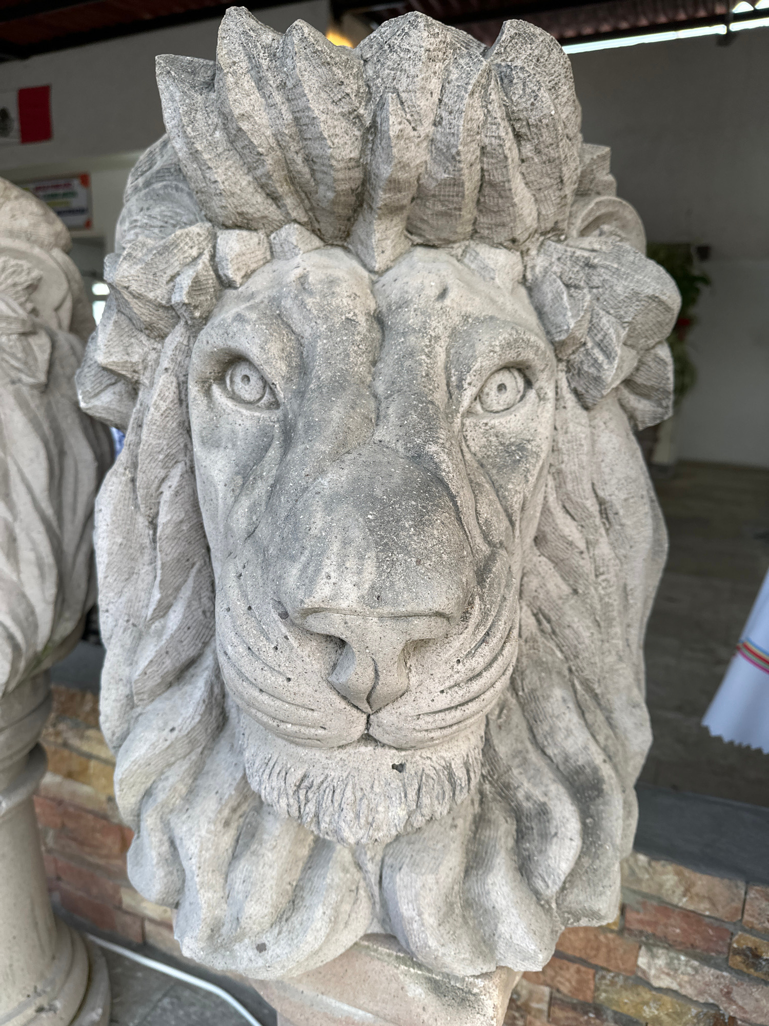 A close-up, high-angle shot shows a weathered, gray stone lion sculpture. The lion's face is the focal point, displaying stylized features, with a textured mane surrounding it. The statue's surface ap…read more