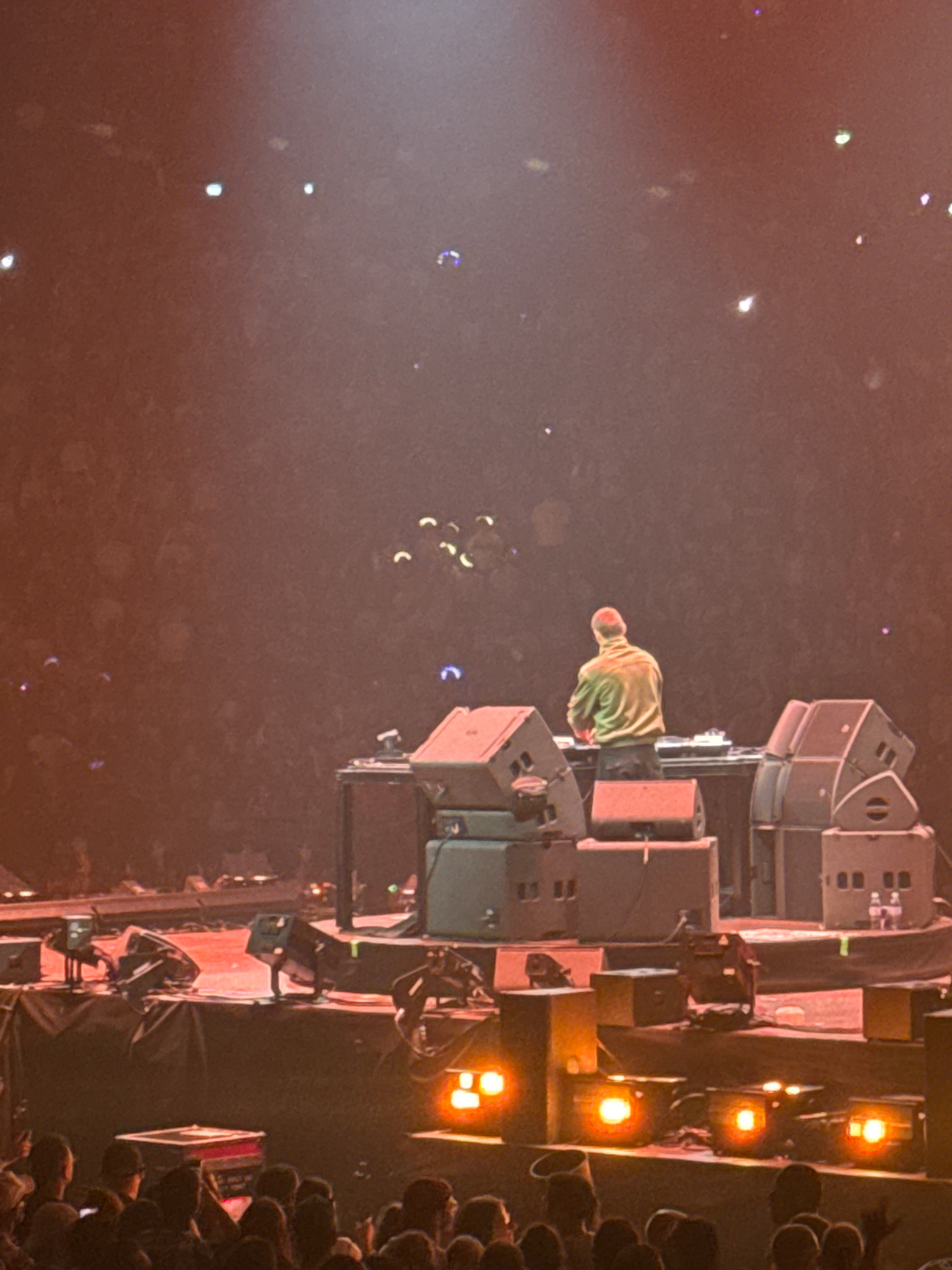The image shows a concert stage, possibly in Paris, France, given the presence of light effects that are popular in French concerts. A person wearing a lime green hoodie stands on the stage behind equ…read more