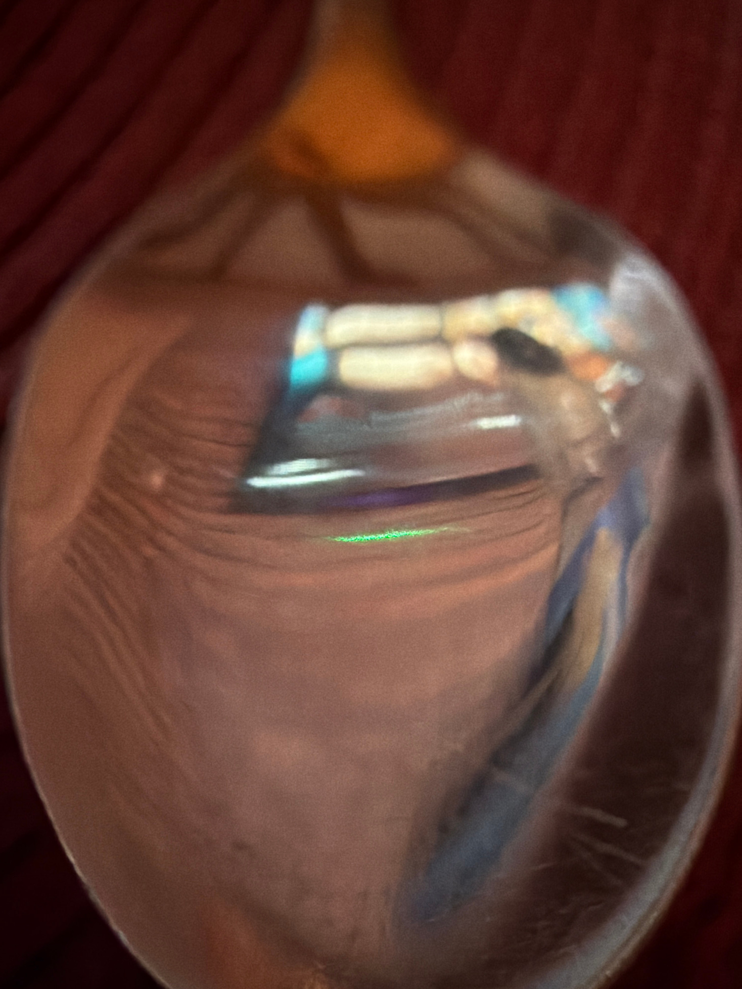 A close-up image depicts a silver spoon with a blurred reflection of a room interior. In the reflection, there are hints of light-colored walls, a window, and possibly furniture. The spoon rests on a…read more