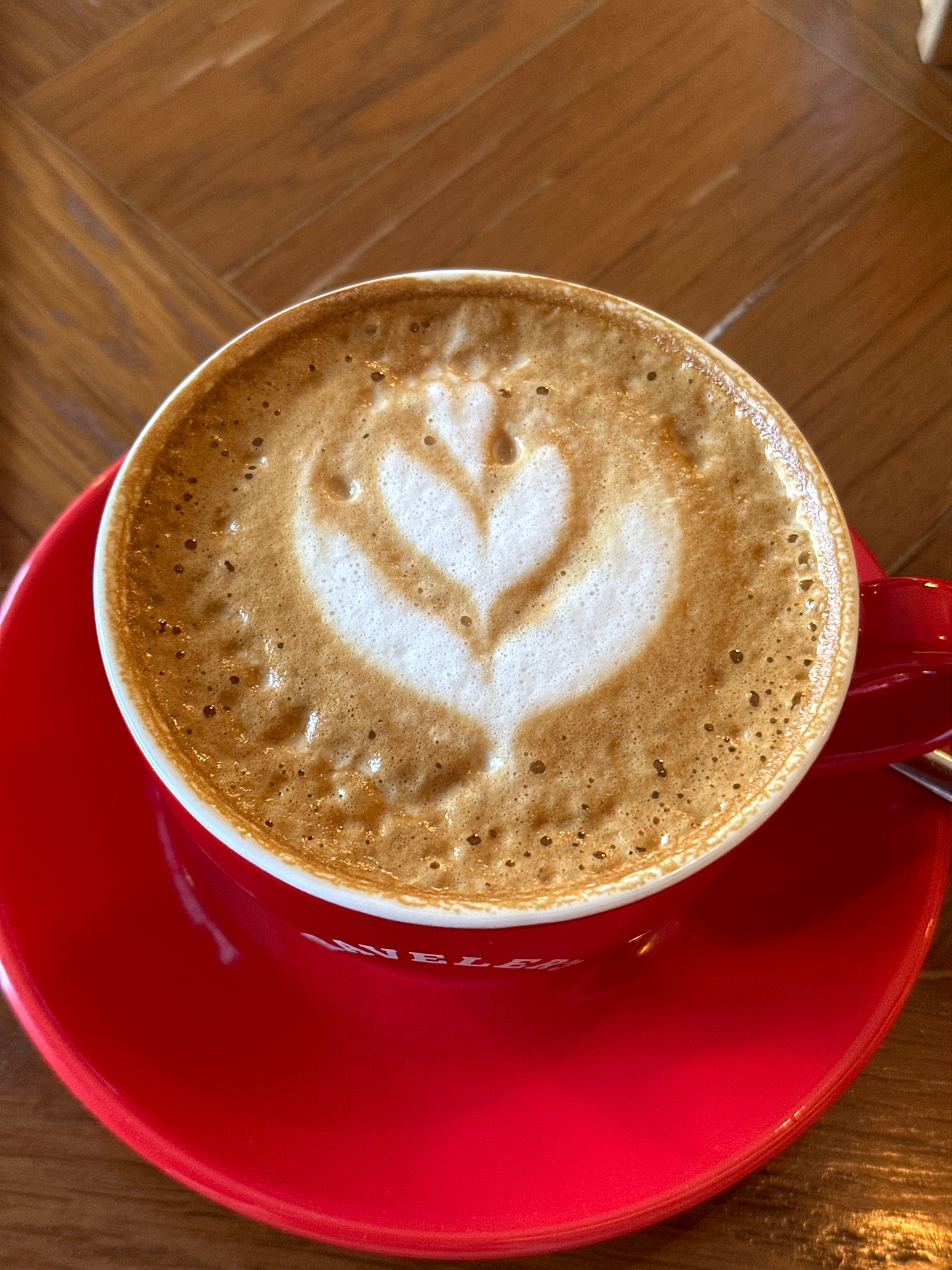 A cappuccino with latte art is presented in a white cup set on a bright red saucer. The cappuccino exhibits a delicate leaf-shaped latte art design. The background shows a wooden surface, possibly a t…read more