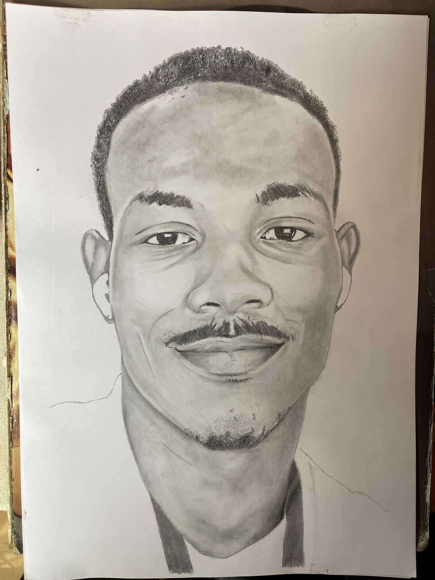 A portrait of a man with a closely cropped, textured hairline is drawn in graphite on white paper. He is depicted from the chest up, looking at the viewer with a smile. The drawing shows shading and d…read more
