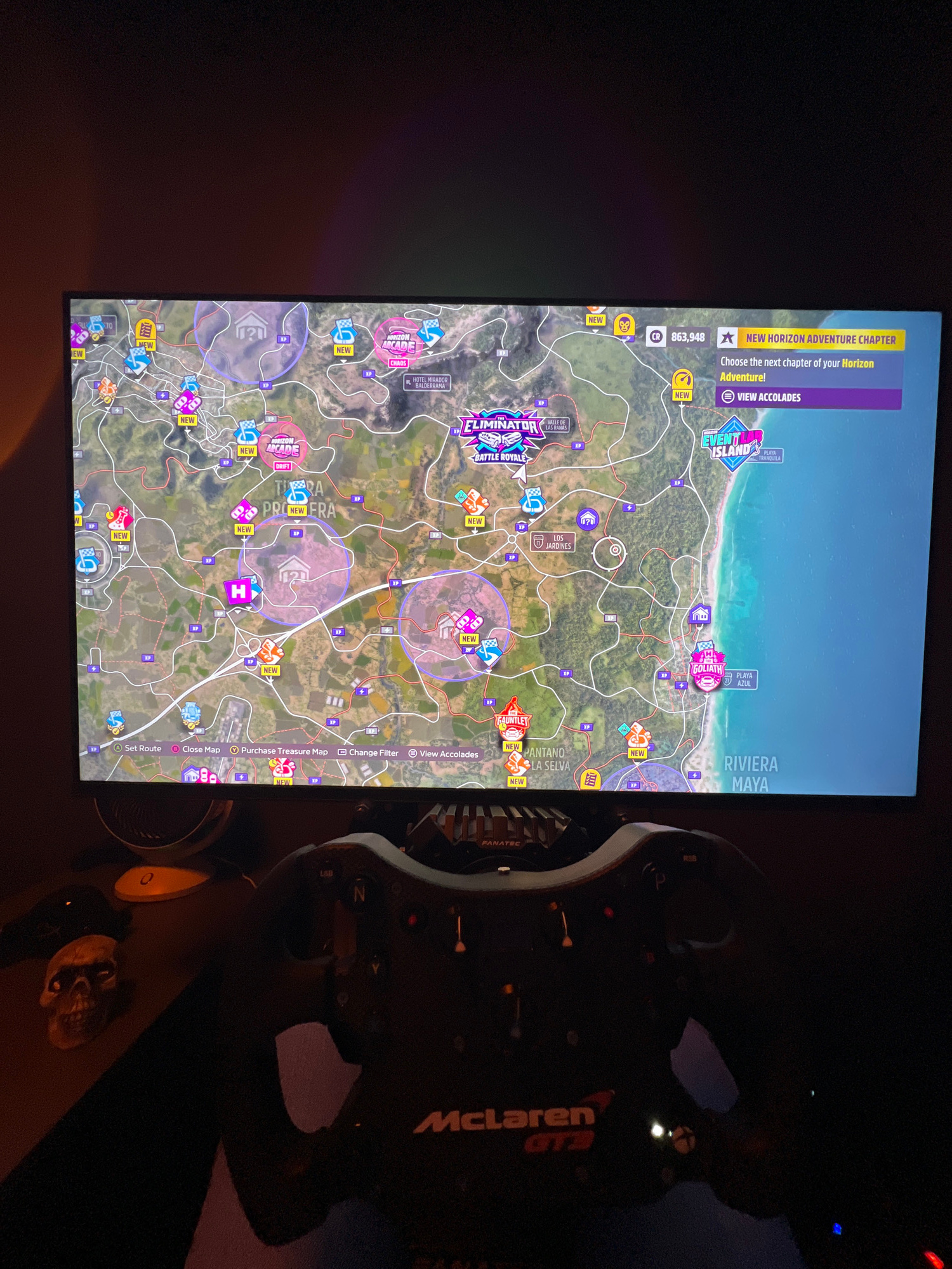 The image displays a gaming setup in a dimly lit room, likely at night. A vertically oriented screen shows a detailed video game map, presumably from Forza Horizon, featuring a vibrant, diverse landsc…read more