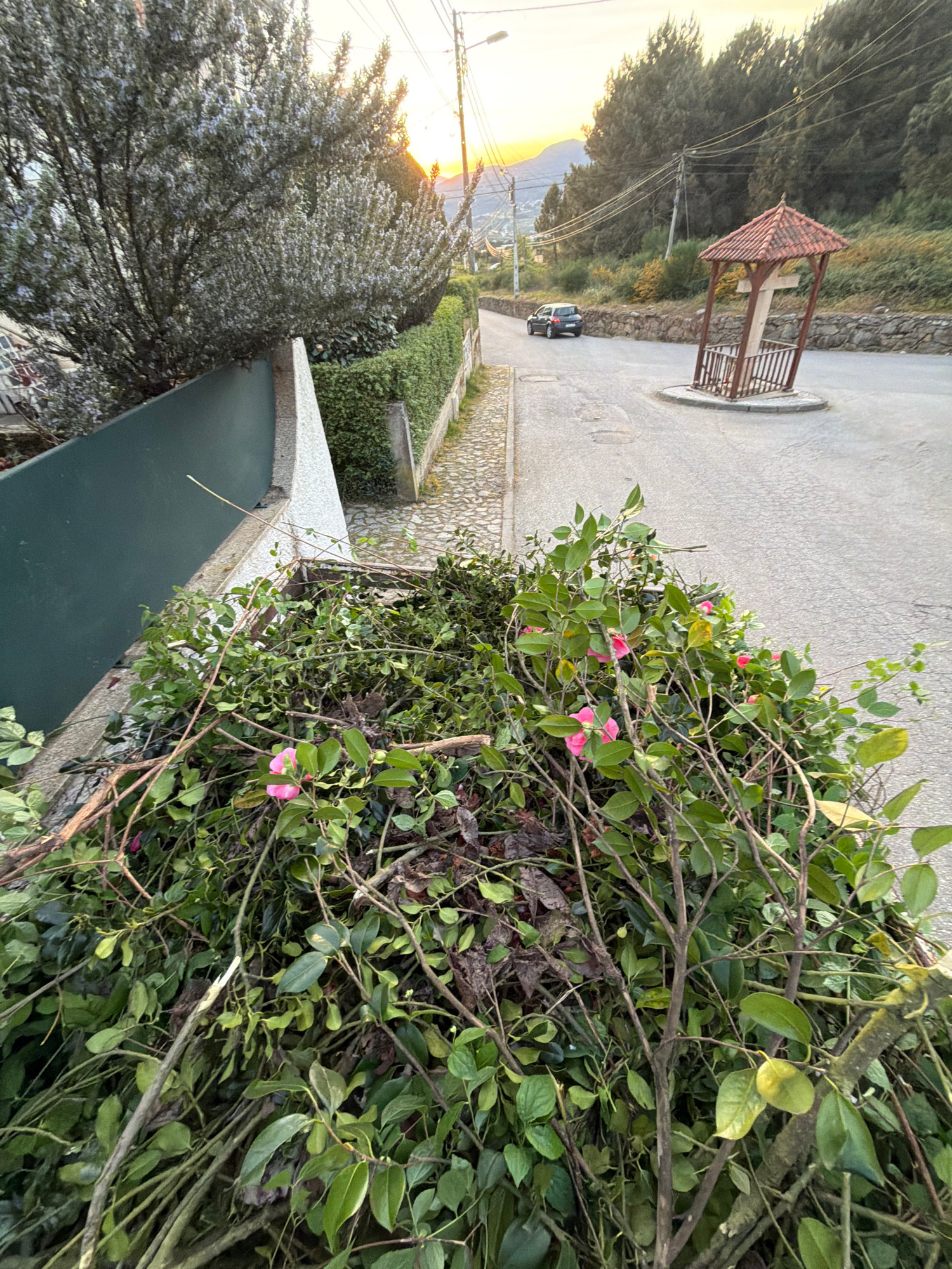 The image depicts an outdoor scene in Vila Real, Portugal. A paved road leads uphill with a wooden structure resembling a gazebo on the left. A vehicle is parked further up the road. Bushes and trees…read more