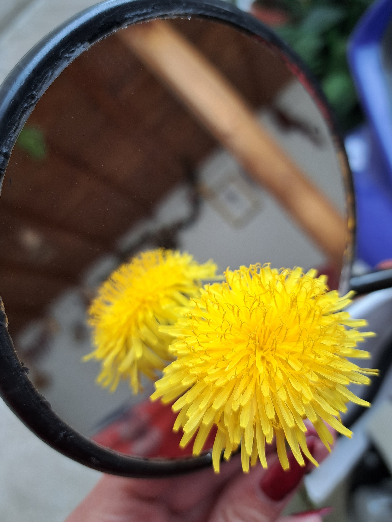 A close-up shot shows a yellow dandelion flower held in front of a circular mirror with a black frame. The flower's reflection is visible in the mirror, which also reflects a blurred interior scene. A…read more