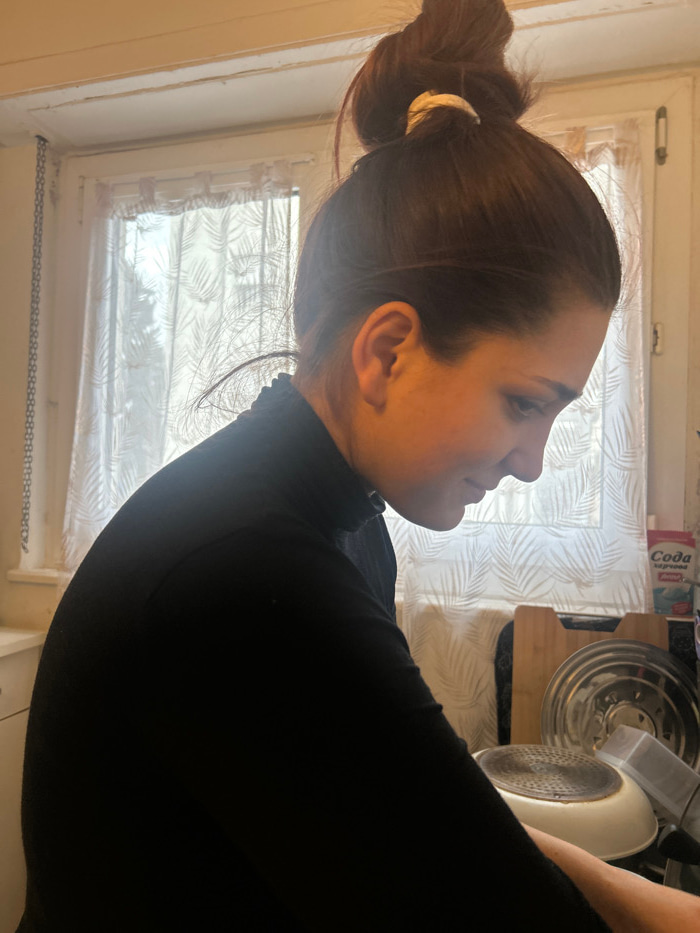 The image captures a close-up profile view of a person, likely female, facing towards the right side of the frame. Her dark brown hair is neatly pulled back into a high bun at the back of her head, se…read more