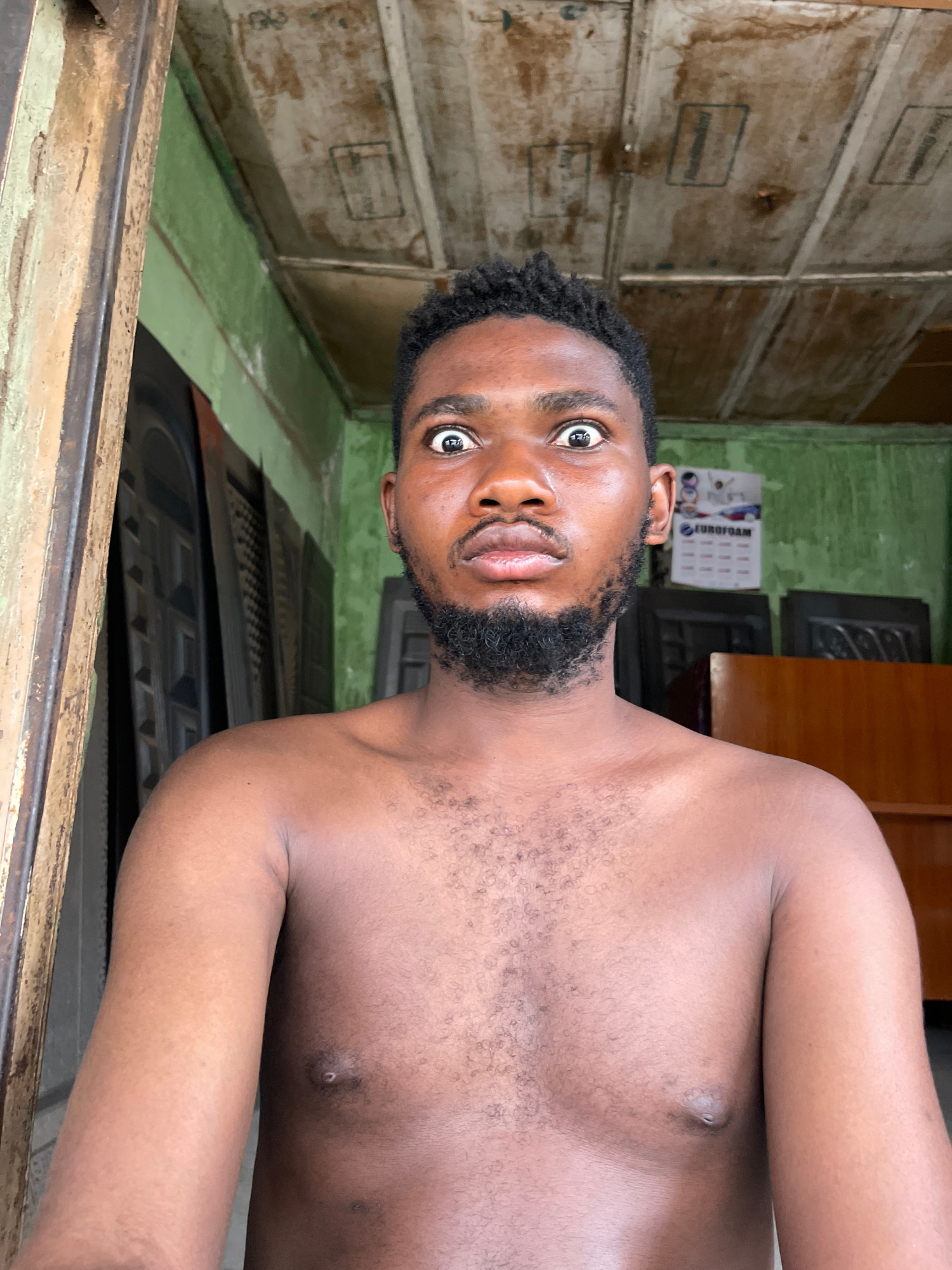 The image depicts a shirtless man with dark hair and a beard looking at the camera. He has wide eyes and a slight expression of surprise. He appears to be indoors, with a background of what looks like…read more