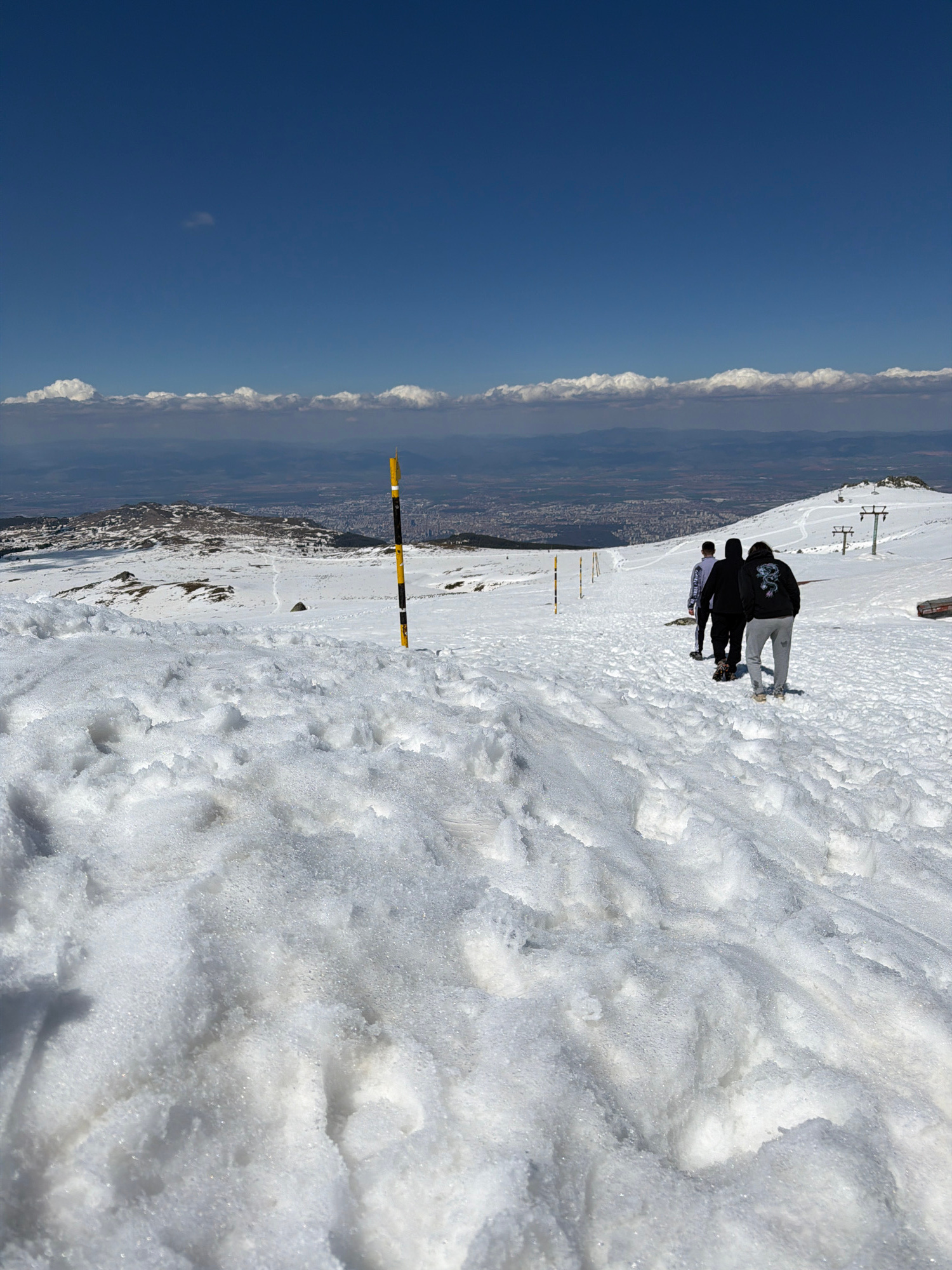 The image captures a snowy mountain scene, likely near Bistritsa, Bulgaria. Three people stand on the snow-covered terrain. Ski lift infrastructure is visible. In the background, a cityscape fades int…read more