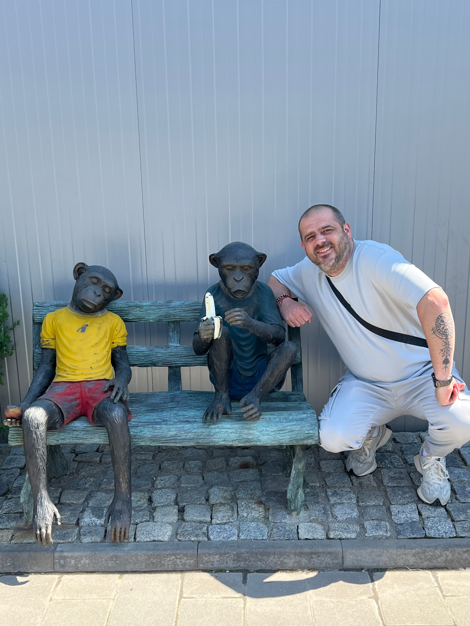 A man is posing with a bench of monkey statues. The man, with a beard and wearing a light-colored outfit, is kneeling next to the bench and smiling at the camera. The bench has two monkey statues, one…read more