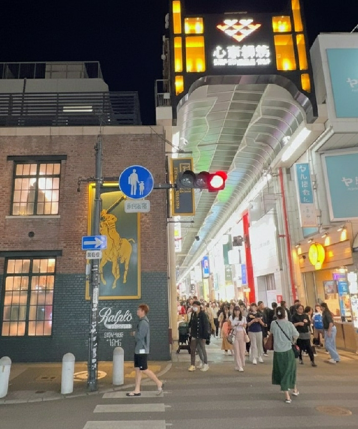 The image depicts a bustling nighttime street scene at the entrance to the Shinsaibashi-suji shopping arcade in Osaka, Japan. On the left, a multi-story brick building with illuminated windows features a large vertical sign displaying a golden polo player on a horse logo, with "Ralph's" text visible below. A light pole in front of the building holds a circular blue pedestrian crossing sign and a rectangular blue directional arrow sign. White bollards line the sidewalk. A pedestrian, dressed in a grey hoodie, black shorts, and dark sandals, walks from left to right across a marked crosswalk in the foreground. To the right, the entrance to the Shinsaibashi-suji shopping arcade is prominent, identified by a large illuminated sign featuring Japanese characters "心斎橋筋" (Shinsaibashi-suji) and a geometric logo. A traffic light positioned beneath this sign displays a red signal. The arcade interior is brightly lit, revealing numerous storefronts and a dense crowd of pedestrians. People are walking in various directions, populating the covered walkway. One individual near the center of the crowd wears a dark jacket and a face mask, pushing what appears to be a cart or stroller. Another person, seen from behind in a green skirt and light top, walks towards the arcade entrance. The sky above is dark, indicating night, with artificial lighting illuminating the entire scene. | Open Wire