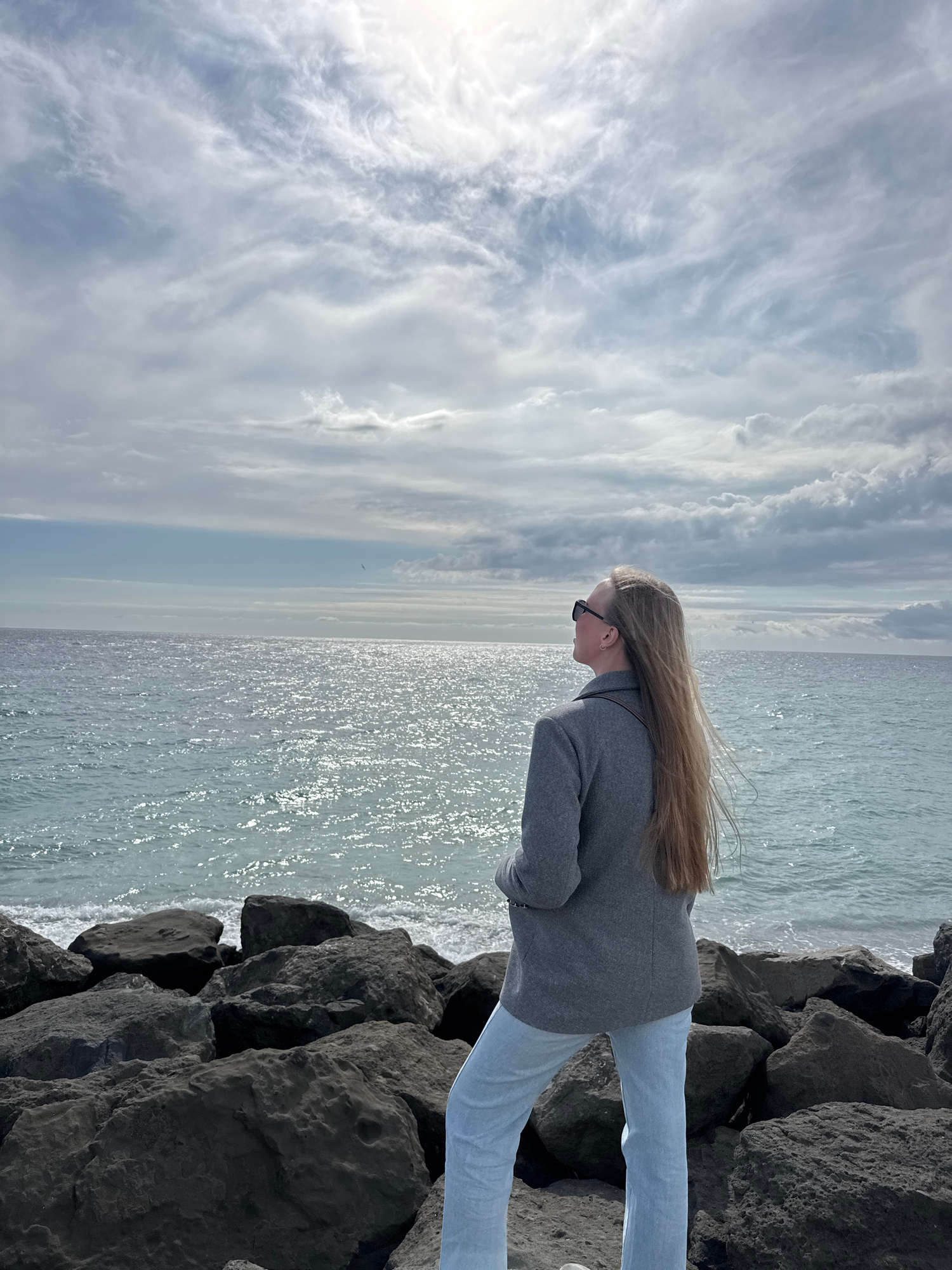 A woman with long blonde hair and sunglasses stands on large, dark rocks next to the ocean. She is wearing a gray coat and light blue jeans. The ocean stretches to the horizon with shimmering sunlight…read more