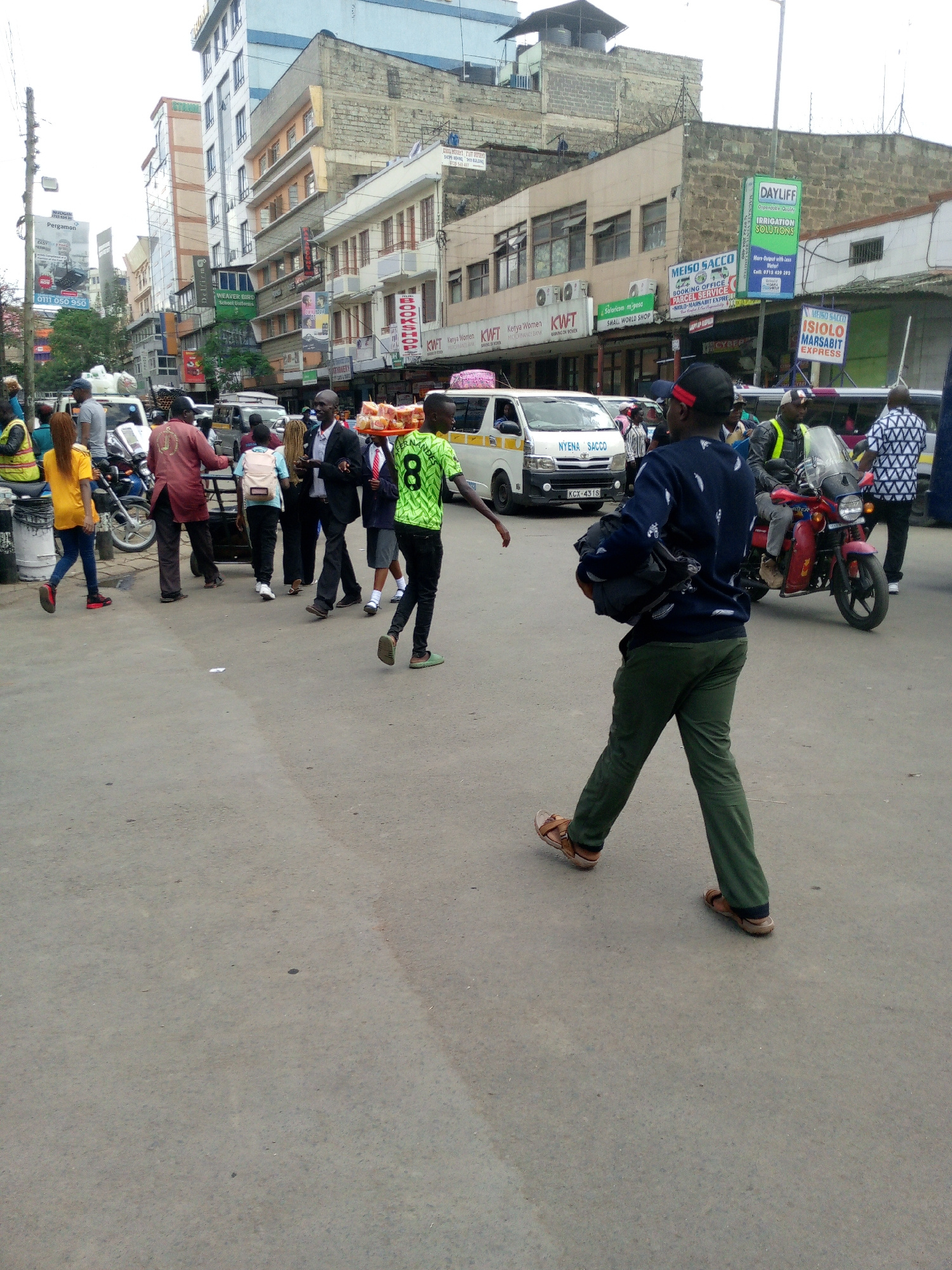 The image captures a bustling street scene in Nairobi, Kenya. In the foreground, a man wearing a dark blue sweater, green pants, and sandals walks away from the camera, carrying a dark-colored bag ove…read more
