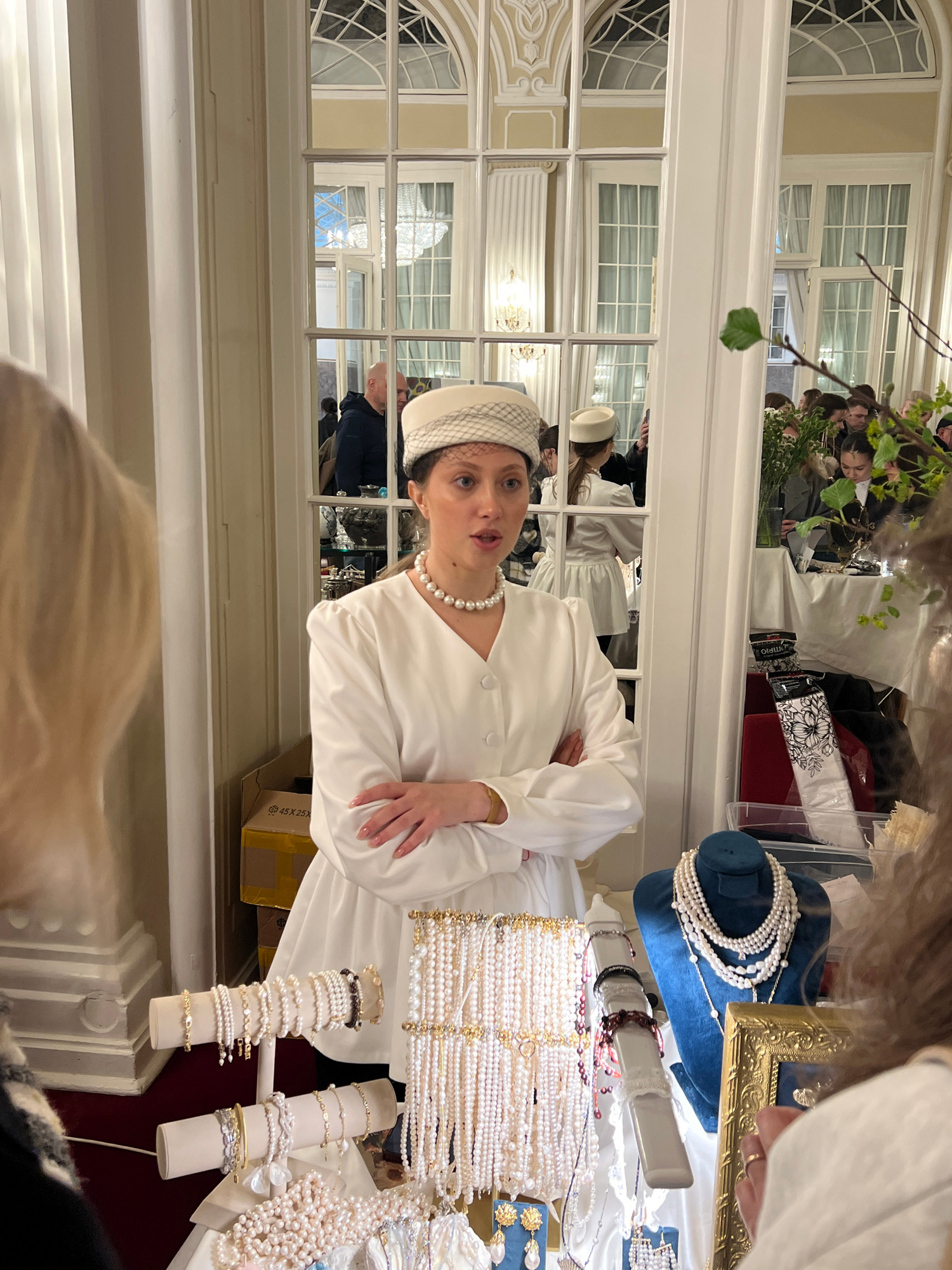 The image shows a woman standing behind a display of jewelry in what appears to be an upscale indoor venue. The woman is wearing a white dress with a matching hat and a pearl necklace. Her arms are cr…read more