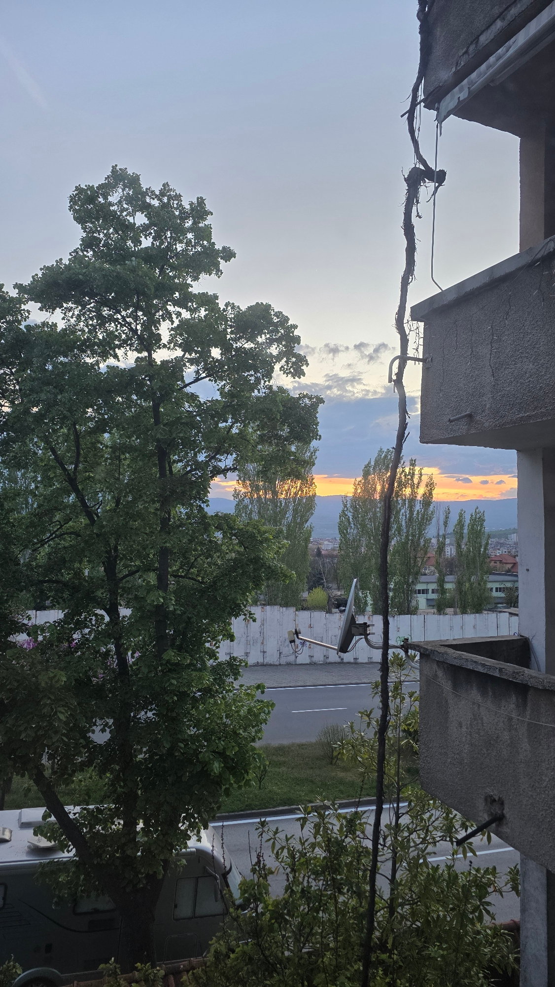The image captures an urban vista at sunset, viewed from a high vantage point, likely a balcony or window in Blagoevgrad, Bulgaria. In the immediate foreground, concrete architectural elements, possi…read more