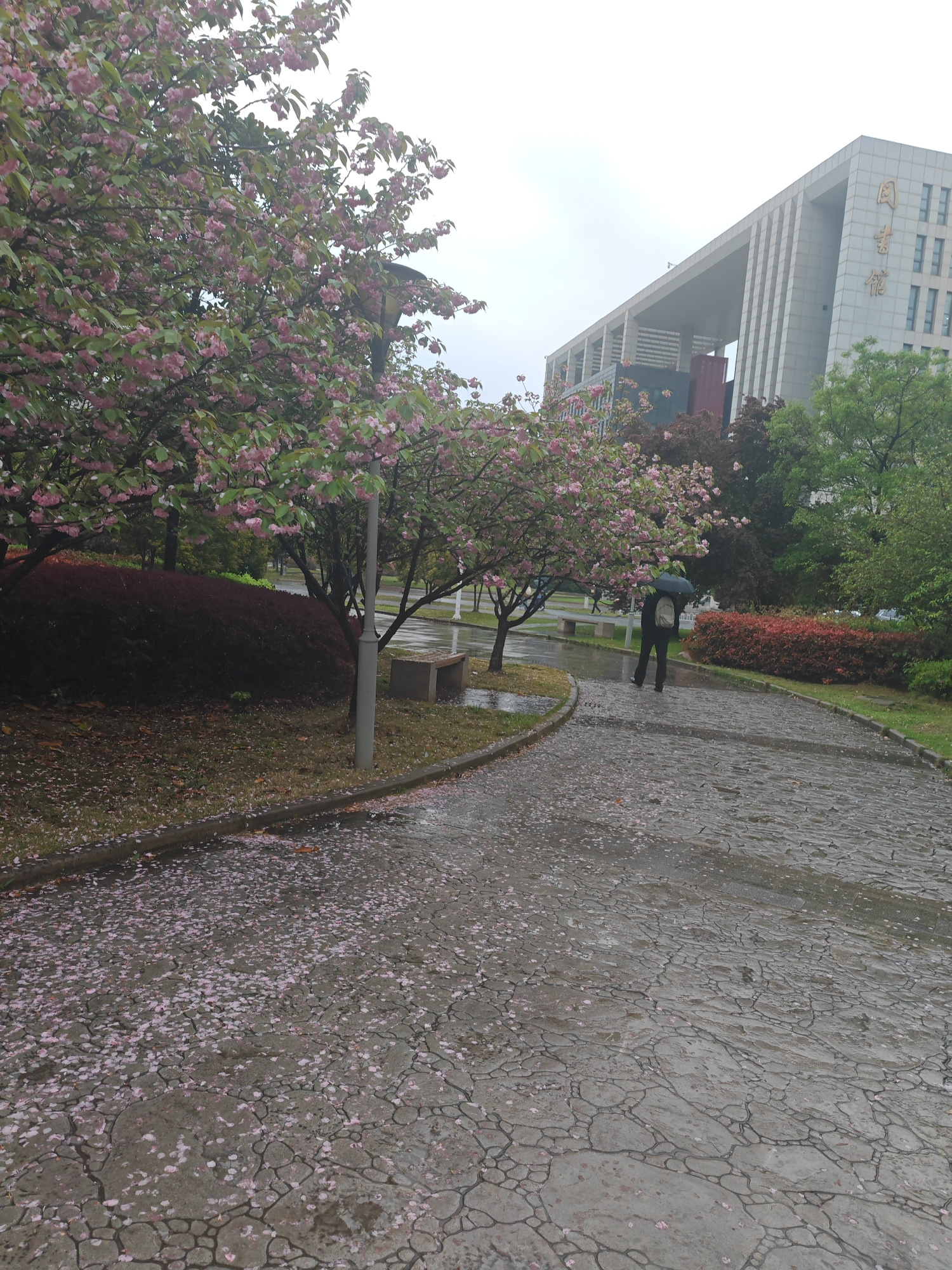The image captures a rainy day scene at Hohai University Jiangning Campus, located in Jiangning District, Nanjing, China. The foreground features a stone-paved path covered with fallen pink cherry blo…read more