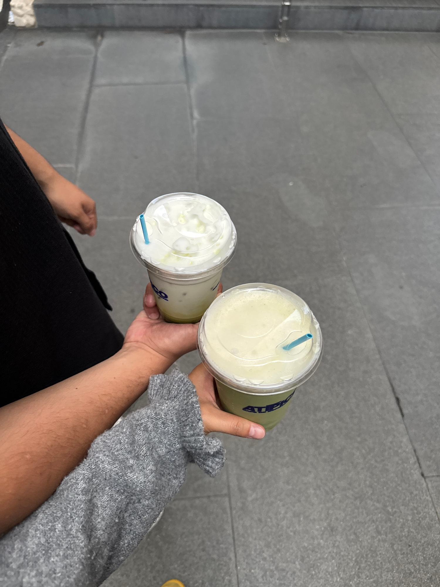 Here is a description of the image: The image shows a person holding two beverages in clear plastic cups with lids and straws, likely matcha lattes. One latte has whipped cream on top. The person is…read more