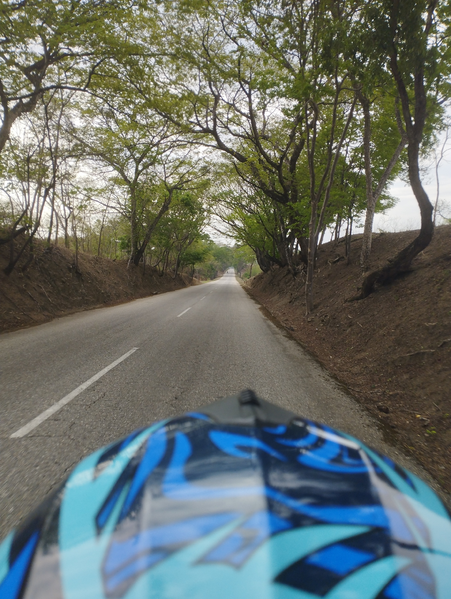 A first-person perspective photograph shows a view from a motorcycle helmet, looking down a paved road lined with trees, likely in the vicinity of Ortiz, Venezuela. The road stretches into the distancβ¦read more