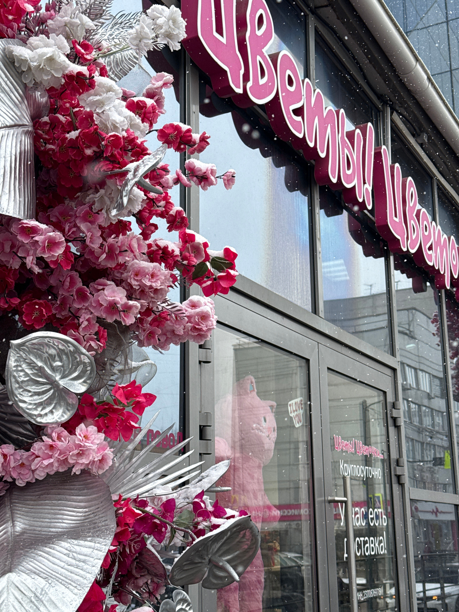 This upward-angled image captures the vibrantly decorated storefront of a building, likely a flower shop, during a light snowfall in Krasnoyarsk, Russia. The foreground features a rich display of arti…read more