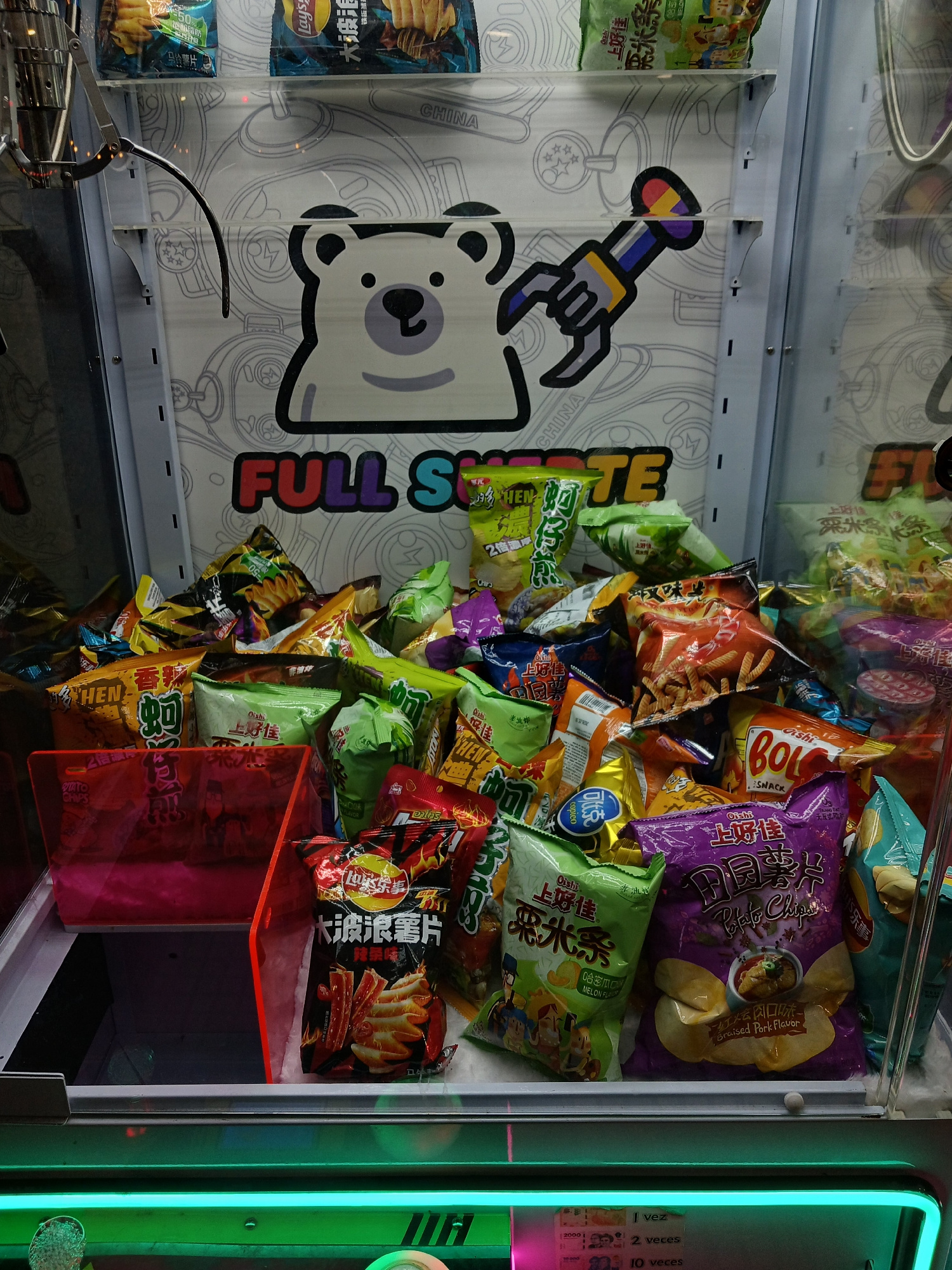 This media file captures the brightly lit interior of a claw game machine, abundantly filled with numerous bags of chips and other snacks. The scene is set indoors, likely within an arcade or entertai…read more