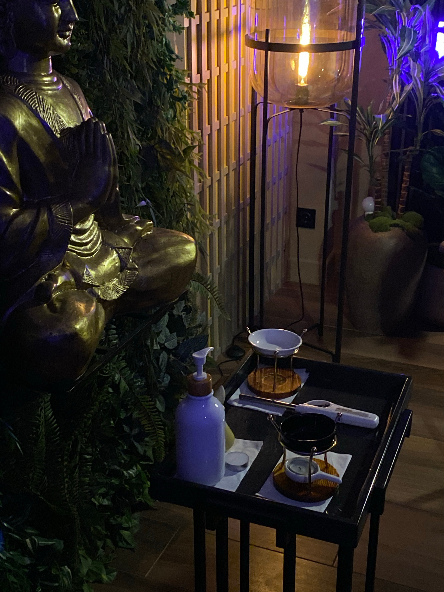The image presents a low-lit, indoor scene. In the foreground is a gold-colored sculpture, likely a reclining human figure, partially obscured by green leafy foliage. A dispenser bottle is placed amon…read more