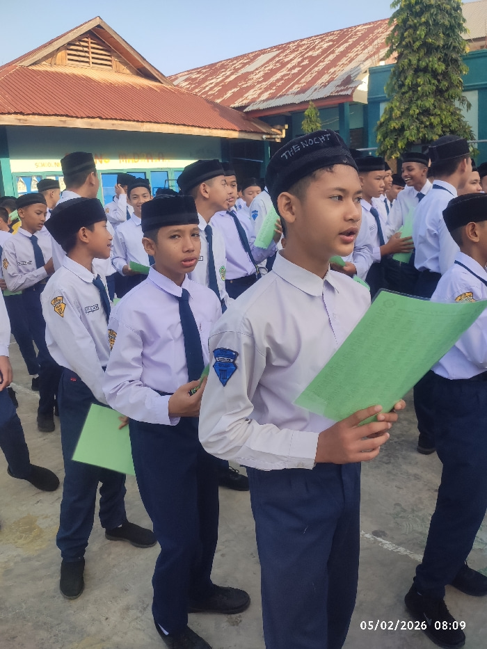 A group of uniformed boys stand outdoors. Each holds a green paper sheet. They wear black hats and mostly white long-sleeved shirts with dark ties. Some have school emblems on their sleeves. They wear…read more