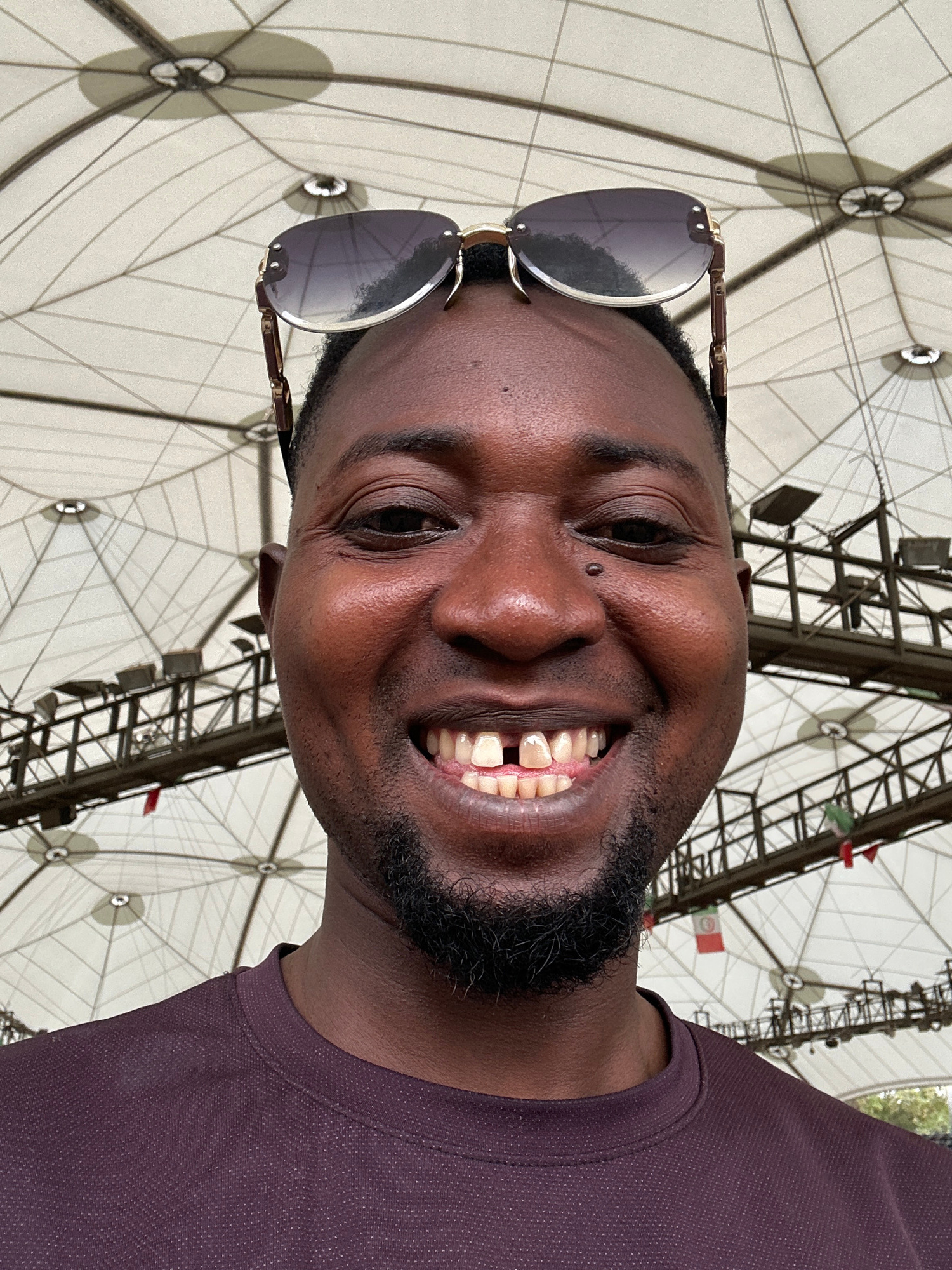 The image shows a smiling man wearing sunglasses, with a beard, in front of a structure. The background structure appears to be made of metal and white fabric, and has a complex, geometric design. Sma…read more