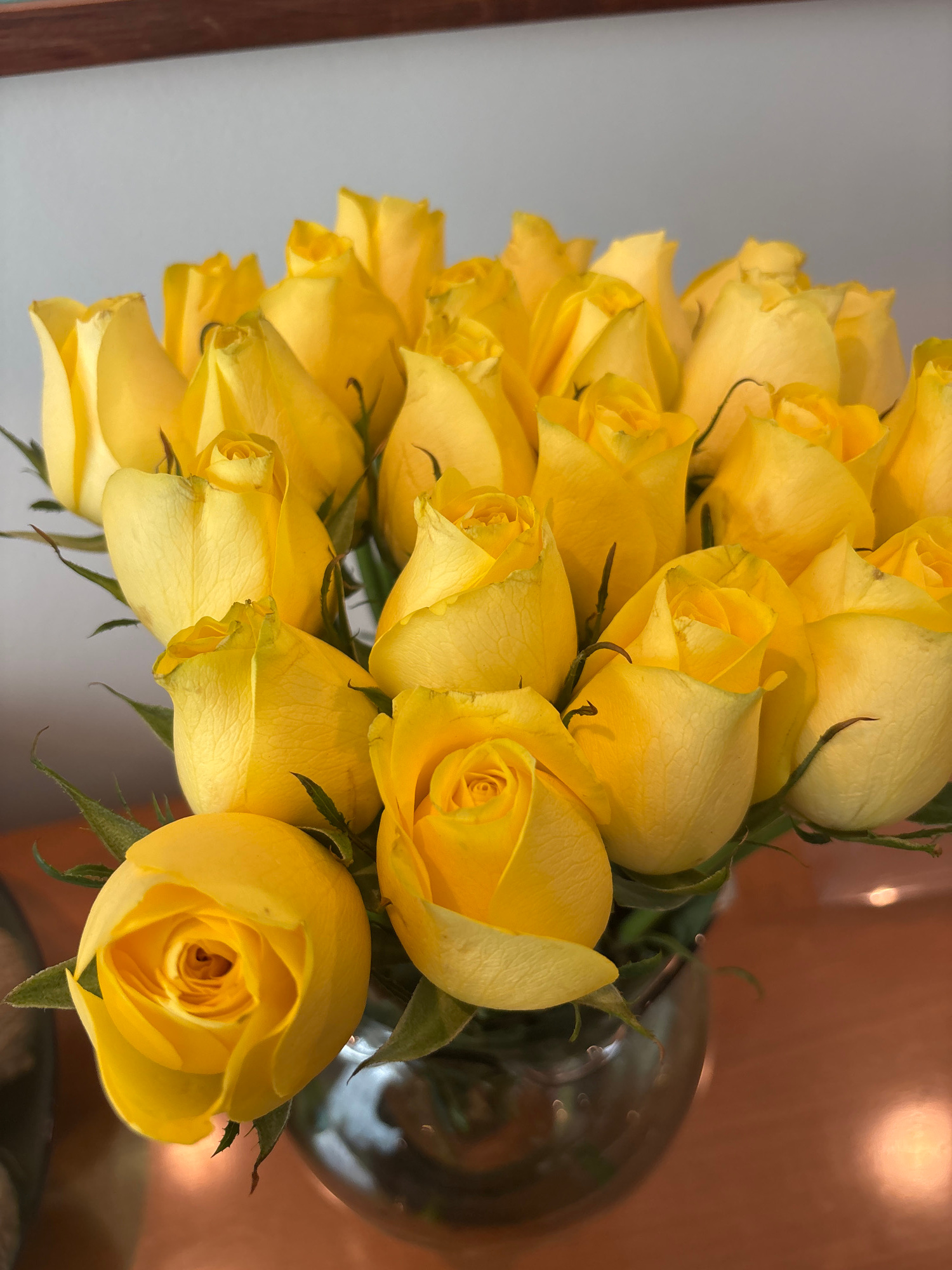 A close-up, slightly angled shot depicts a bouquet of approximately twenty-five yellow roses arranged in a transparent vase. The roses are tightly packed, their petals forming a dense cluster. The vas…read more