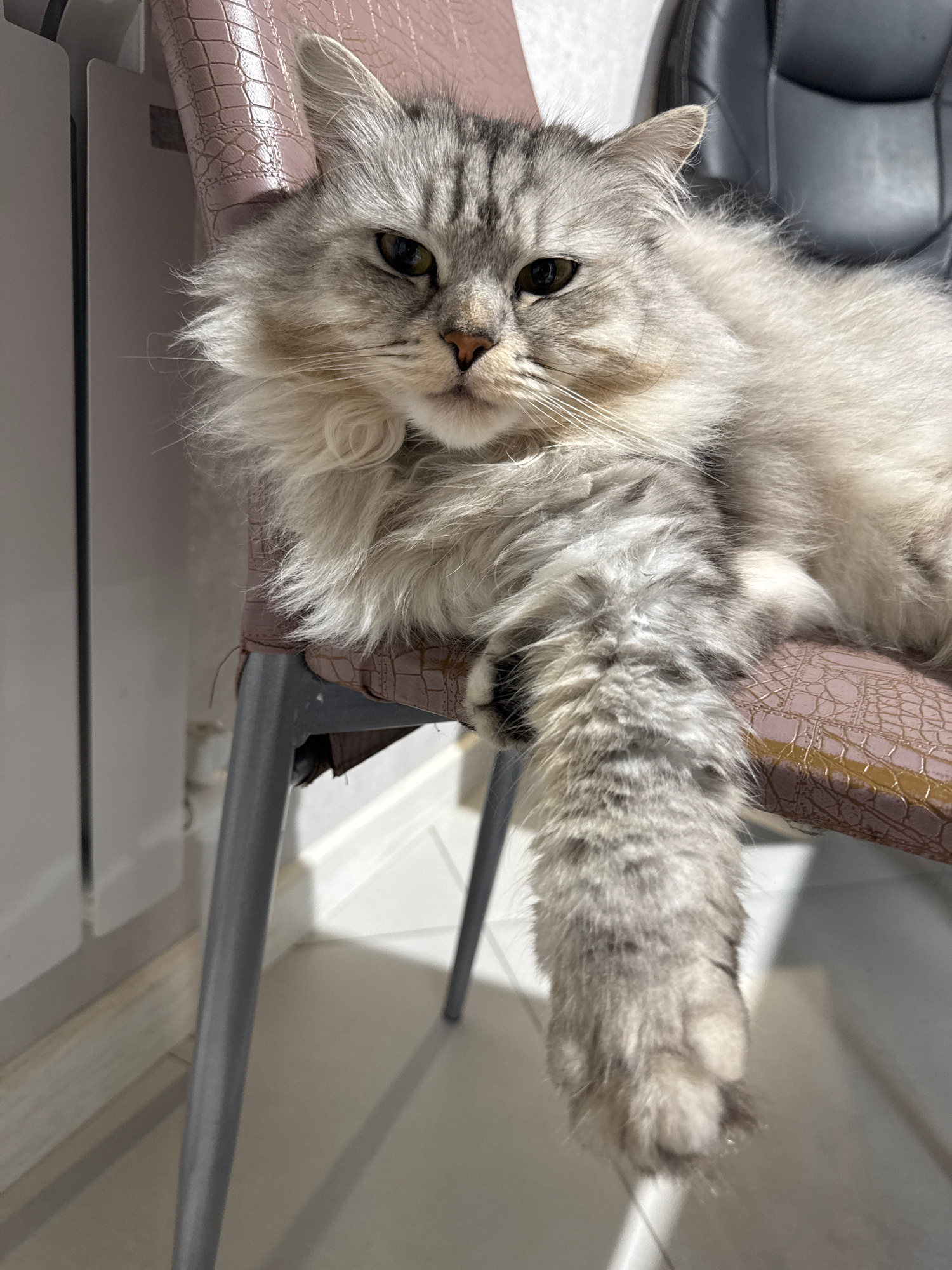 A fluffy, grey and white cat lies upside down on a chair. The chair has a light pink seat. The cat's right front paw is extended forward. A black chair is partially visible in the upper left corner. A…read more