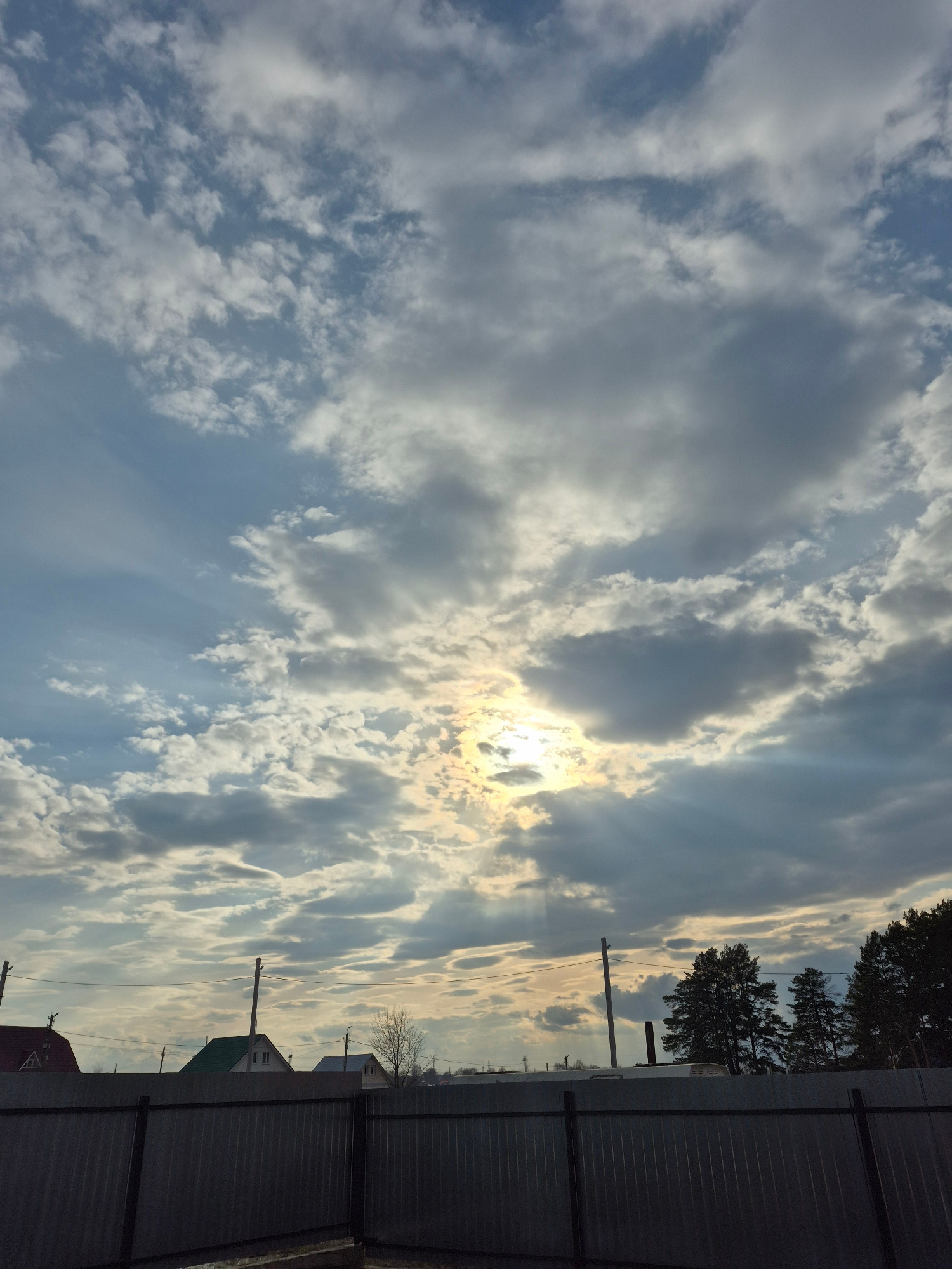 The image shows a sky filled with numerous clouds of varying size and density. Sunlight is visible through the clouds, creating a diffused, bright area in the sky. Part of a fence is visible on the ri…read more