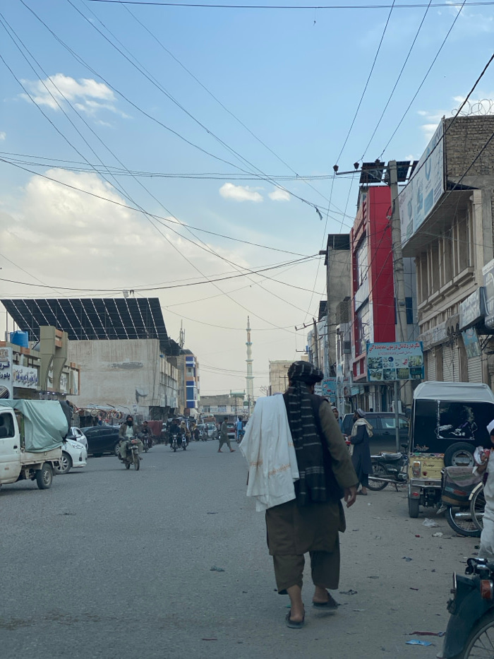 The image depicts a daytime street scene in an urban area of Kandahar, Afghanistan, under a partly cloudy sky crisscrossed by numerous tangled overhead utility wires. The paved asphalt street shows si…read more