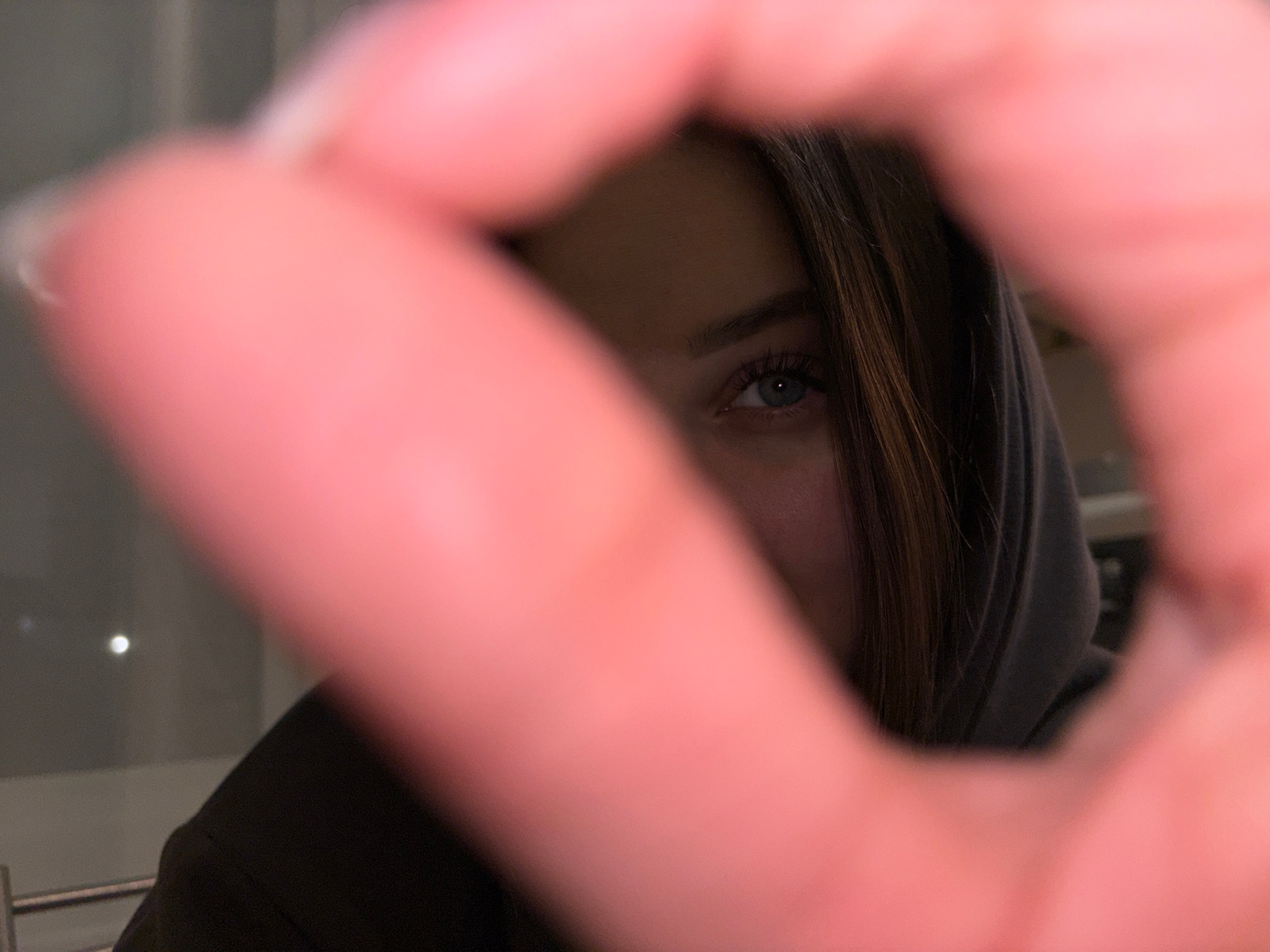 A close-up, obscured image shows a person's eye partially visible through a blurred circle created by fingers. The person has brown hair and is wearing a dark-colored hood. The background appears to b…read more