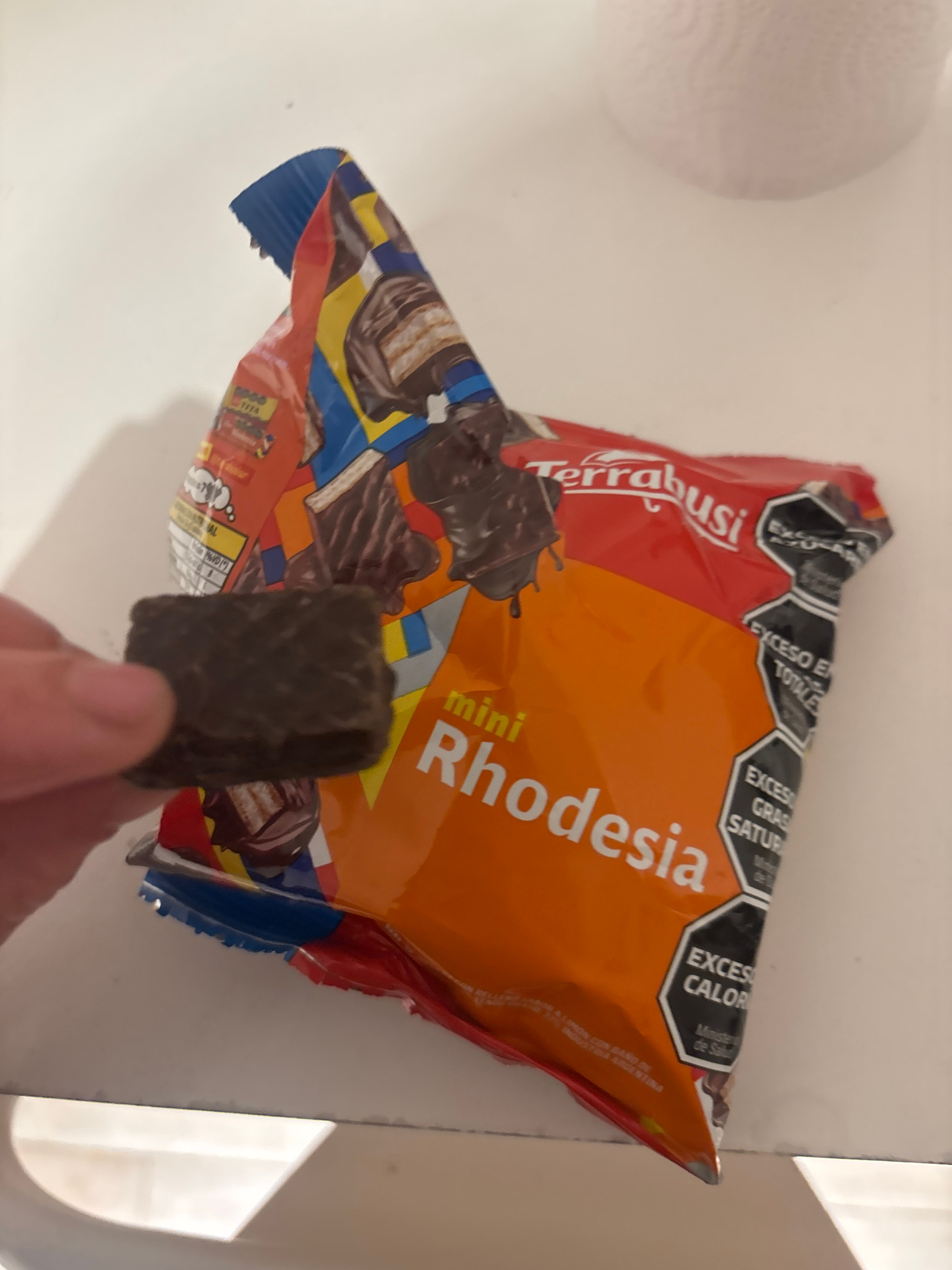 The image shows a partially opened package of "Terrabusi mini Rhodesia" chocolate wafers being held by a person's fingers. The package is predominantly orange with red and blue accents. The brand name…read more