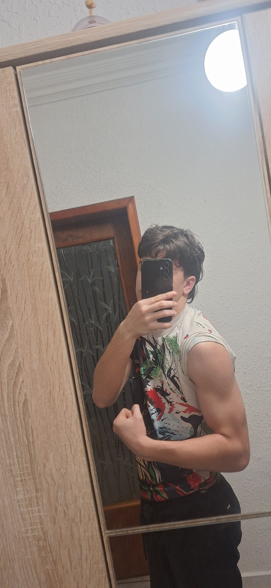 A person is photographed in a mirror. The person is holding a phone up to the mirror and taking a selfie, flexing their right arm. The person is wearing a printed t-shirt and dark pants. The backgroun…read more