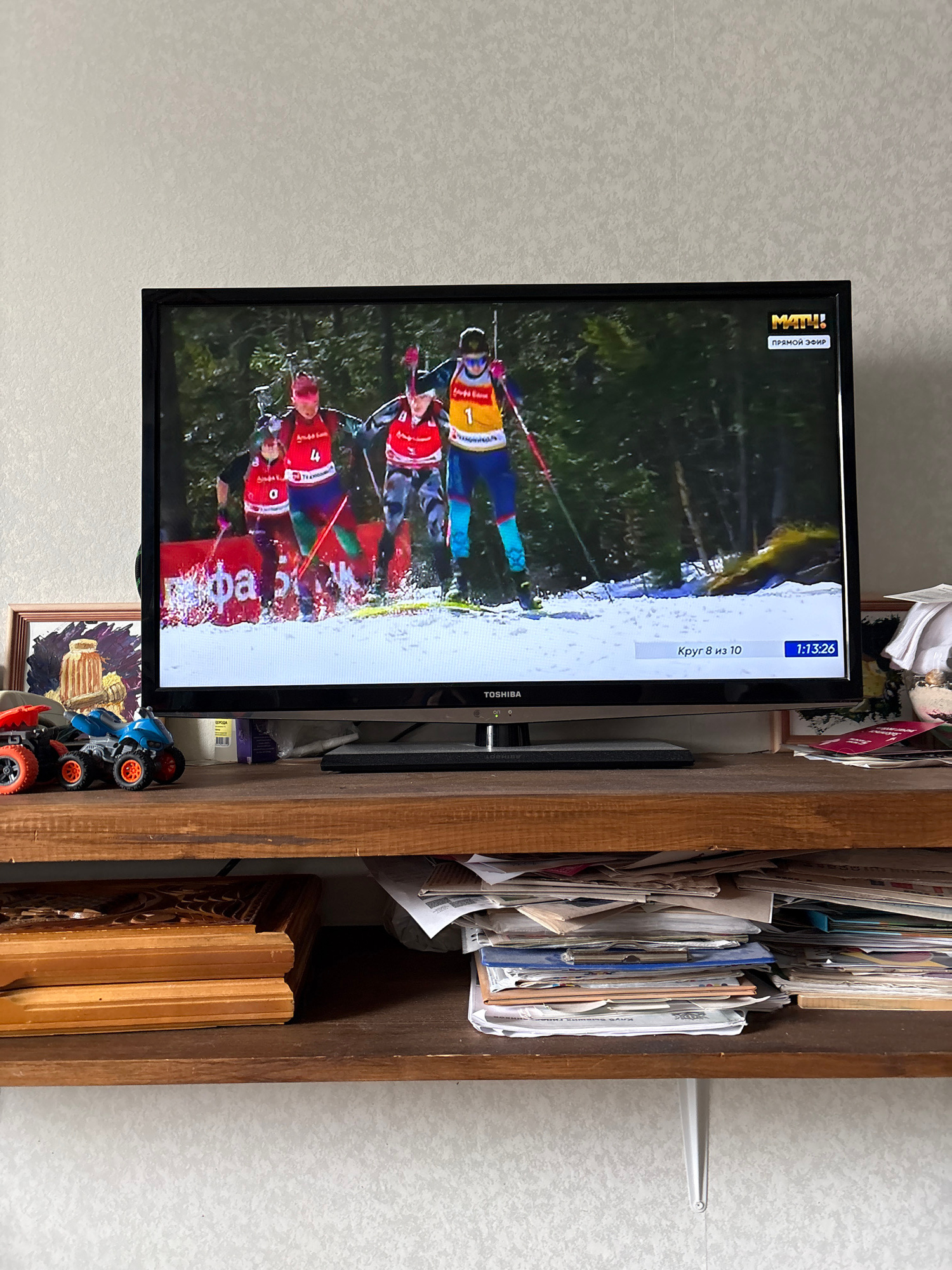 A Toshiba television is mounted on a brown wooden shelf, displaying a live broadcast of a cross-country skiing race. The screen shows skiers in red and blue racing suits, with a display indicating "Кр…read more