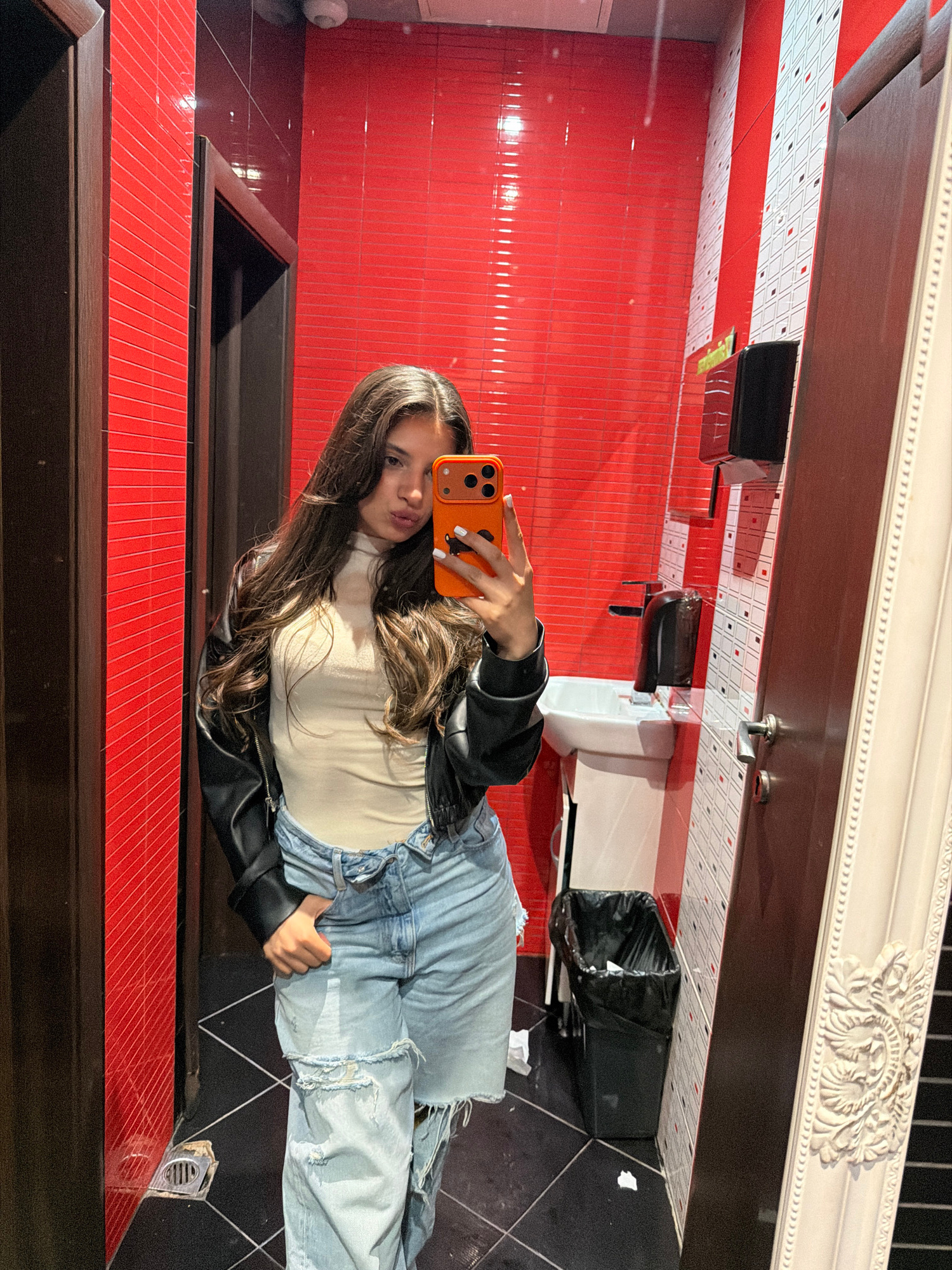 A young woman captures a mirror selfie in a public restroom, likely located in Pernik, Bulgaria. She has long, flowing dark brown hair and is dressed in a light, possibly cream-colored, high-neck top,…read more