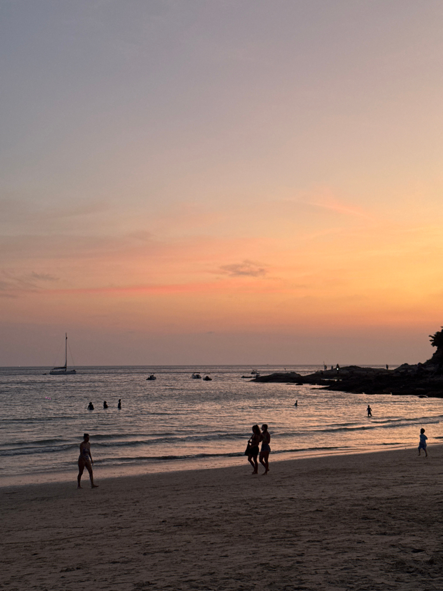 The image depicts a beach scene in Rawai, Thailand, during a sunset. The sky is a mix of orange, pink, and gray hues. Silhouettes of people are visible on the beach. The beach is wet with small ripple…read more