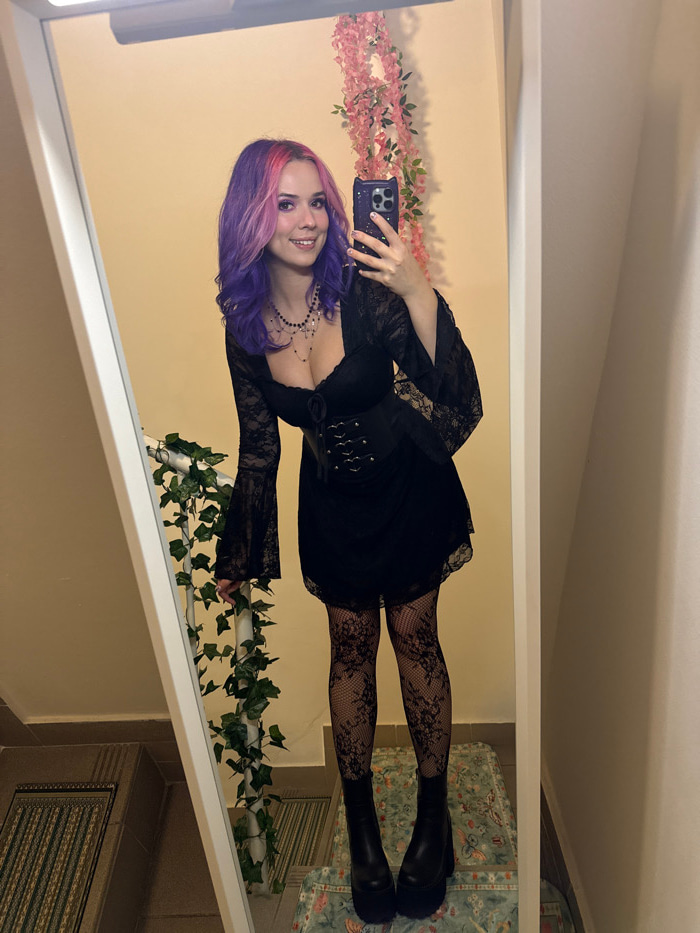 The image displays a full-body mirror selfie taken indoors. A young female individual with wavy purple and pink hair is depicted, smiling at the camera. She is wearing a black lace-sleeved dress or to…read more
