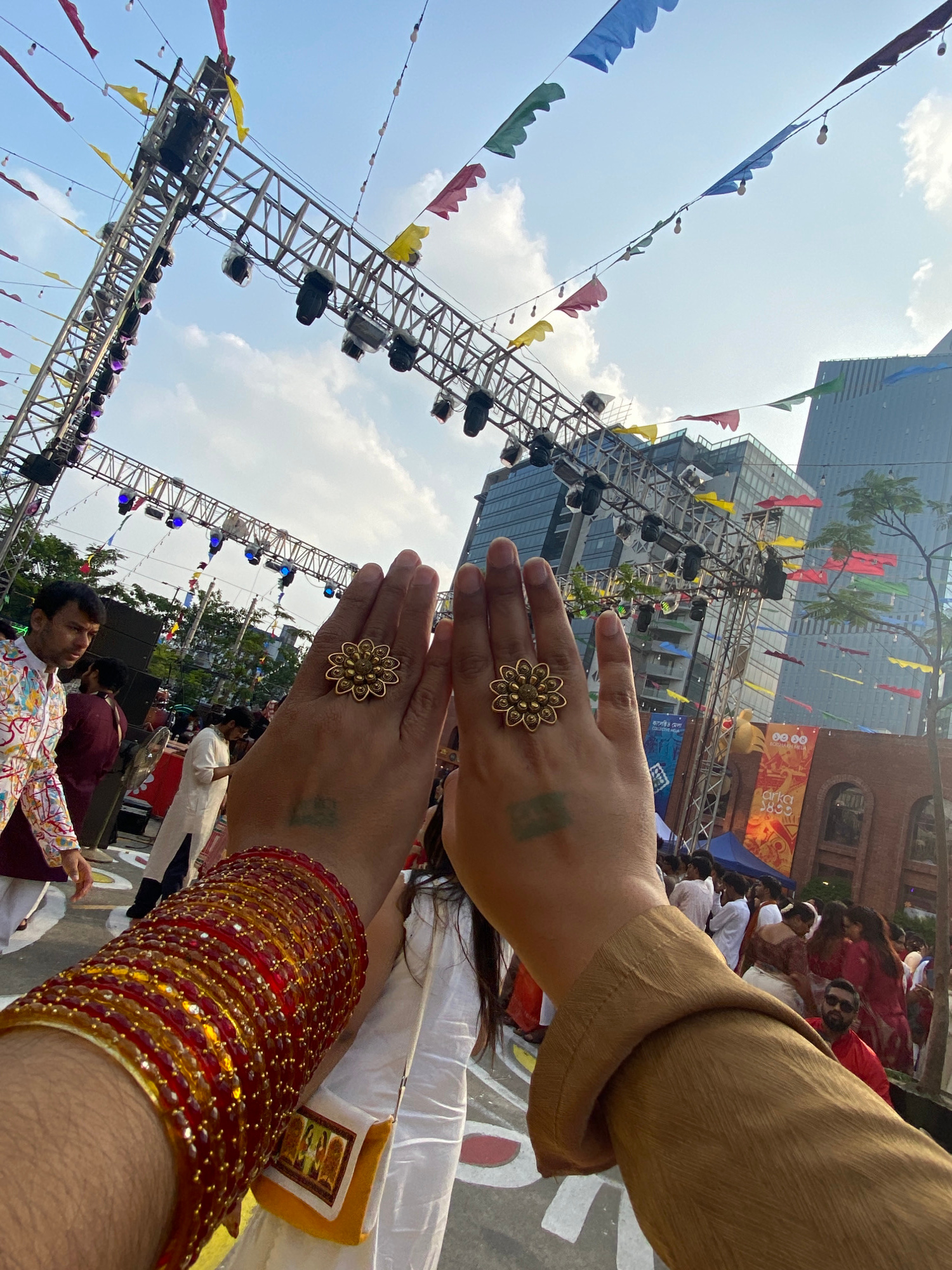 The image depicts a street scene in Dhaka, Bangladesh. Two hands are prominently displayed, one with a golden ring and green ink markings, and the other adorned with red and gold bangles. These hands…read more