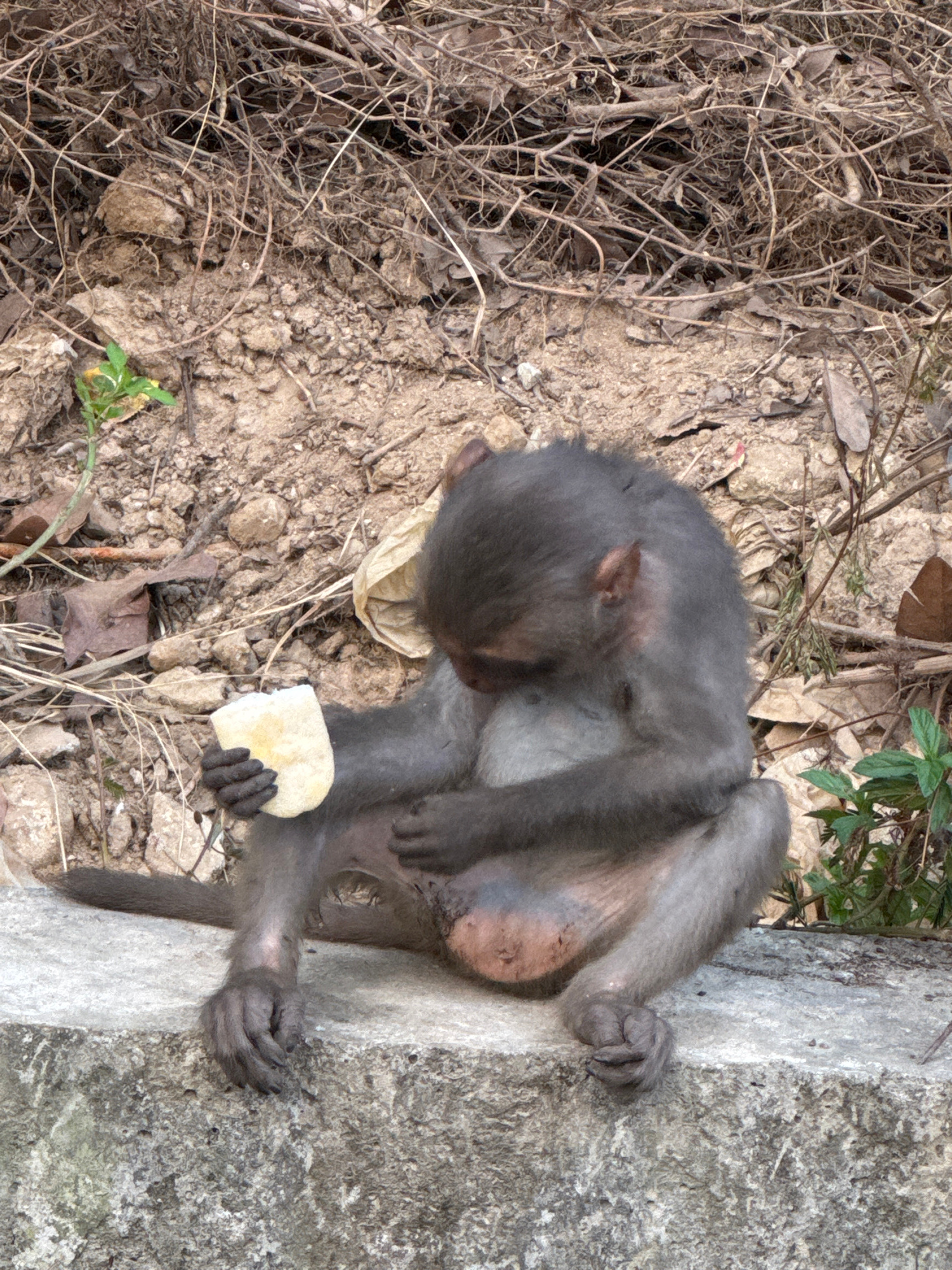 A juvenile monkey rests on the ground next to a concrete structure. The monkey has grey fur and is holding a white food item in its left hand. The ground is composed of dirt, twigs, leaves, and rocks.…read more