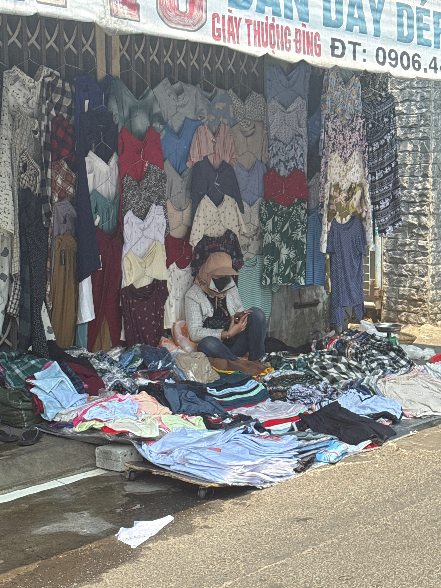 A street-level scene captures a crowded outdoor market in Đà Nẵng, Vietnam. Stacks of used clothing are displayed for sale, covering makeshift tables and ground space. A person is seated amidst the pi…read more