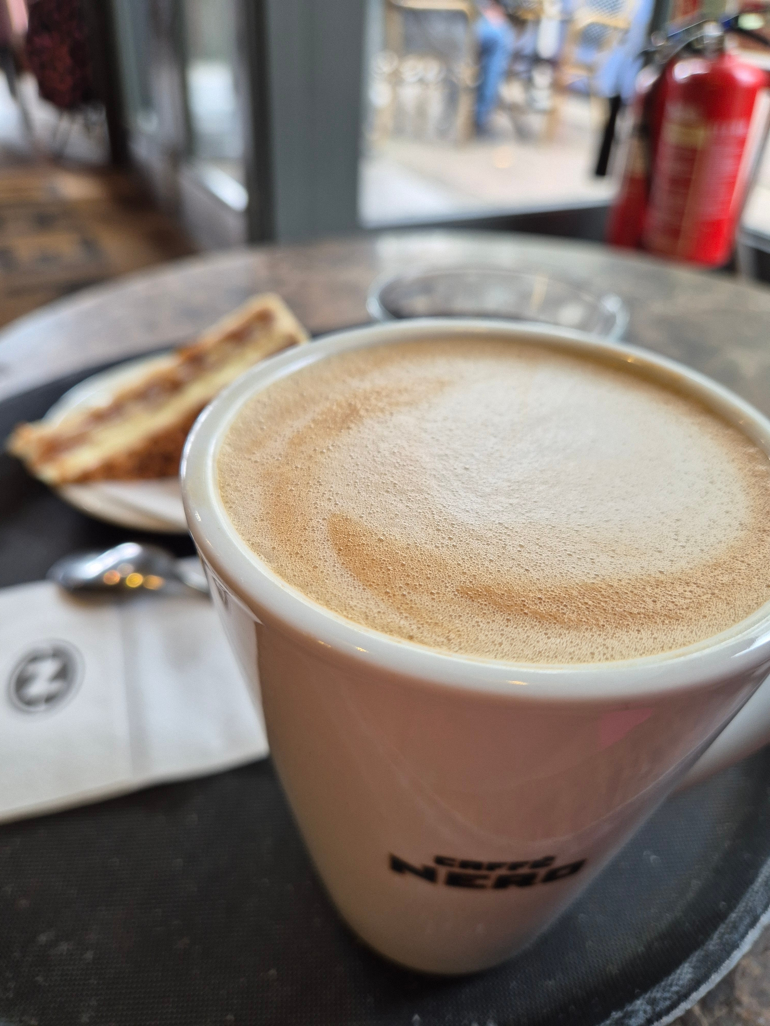 A close-up, overhead shot captures a moment of indulgence at a Caffè Nero coffee shop, likely in West Suffolk, United Kingdom. The central focus is a white ceramic mug, angled and partially rotated, f…read more